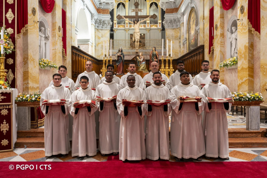 A tizennégy szentelendő ferences szerzetes a világ különböző pontjairól származik, az Egyház egyetemességét kifejezve.
