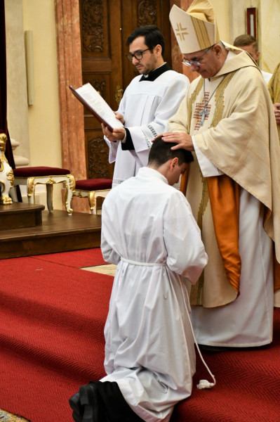 Ezt követően a jelöltek tanúságot tettek szándékuk tisztaságáról, hogy magukat az Egyházban egészen Krisztusnak szentelik Isten iránti szeretetből és a nép javára. „Isten tegye teljessé a jót, amit megkezdett benned” – hangzott a főpásztor imája, miután a jelöltek külön-külön eléje térdelve tiszteletet és engedelmességet fogadtak az egyházmegye mindenkori püspökének. A Mindenszentek litániáját, amely alatt a jelöltek a teljes önátadás jeleként arccal a földre borultak, a liturgia zenei szolgálatát ellátó Bajkai-Fábián Róbert székesegyházi orgonista és az Exultate kórus tagjai énekelték. Orgonán játszott még Simona Mustețiu tanár. Ezt követően a főpásztor kézrátétele és imája által szerpappá szentelte a jelölteket, akik Filip Dorin Gyula csáki plébános és Patașan Gheorghe kiskrassói plébános segítségével magukra öltötték a szerpapok jellegzetes stóláját és a dalmatikát. Végezetül a már felszentelt diakónusok átvették a megyéspüspöktől az evangéliumoskönyvet, annak jeleként, hogy a szerpap egyik kiemelkedő feladata Isten igéjének hirdetése.