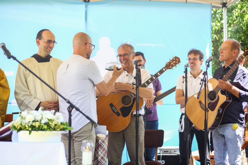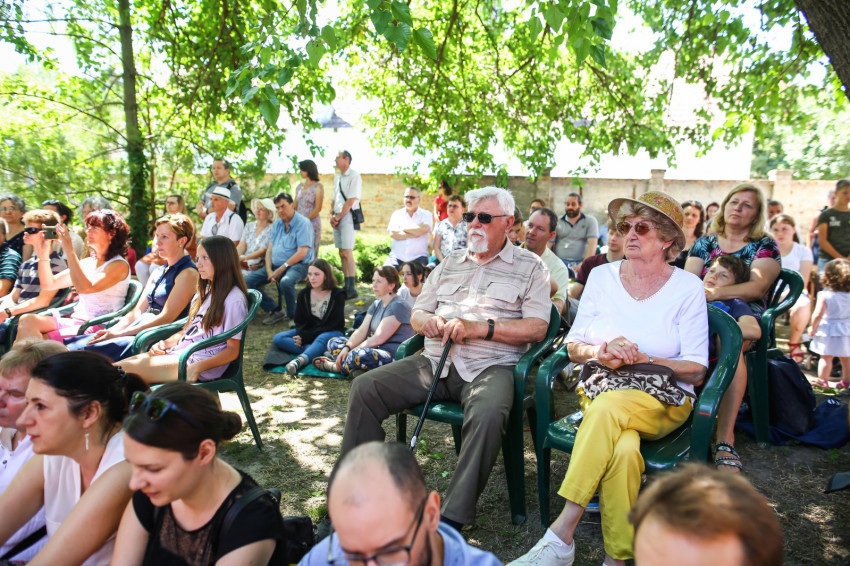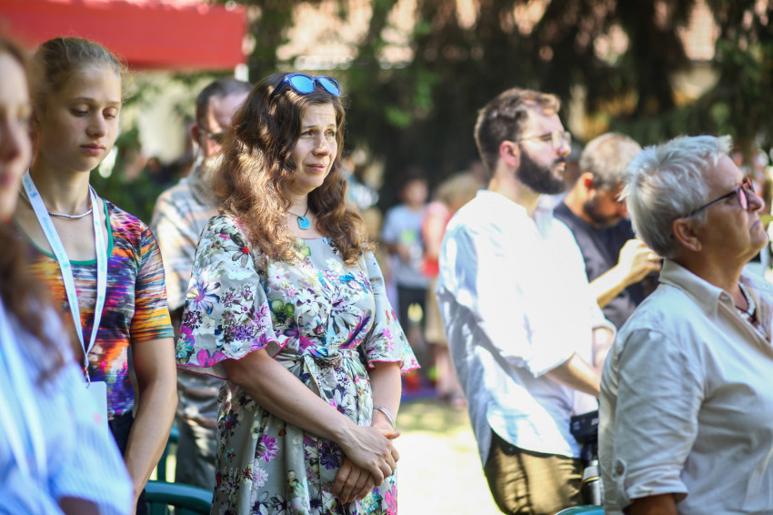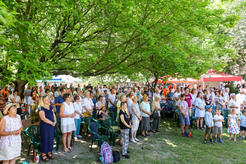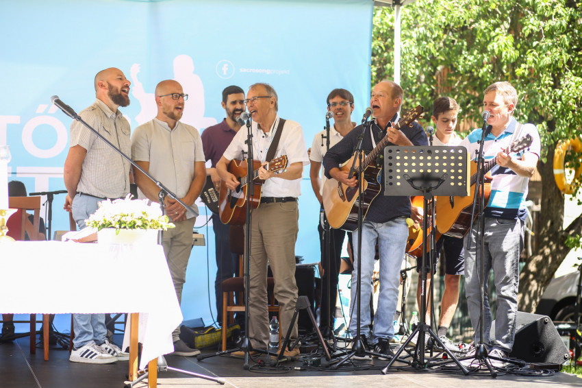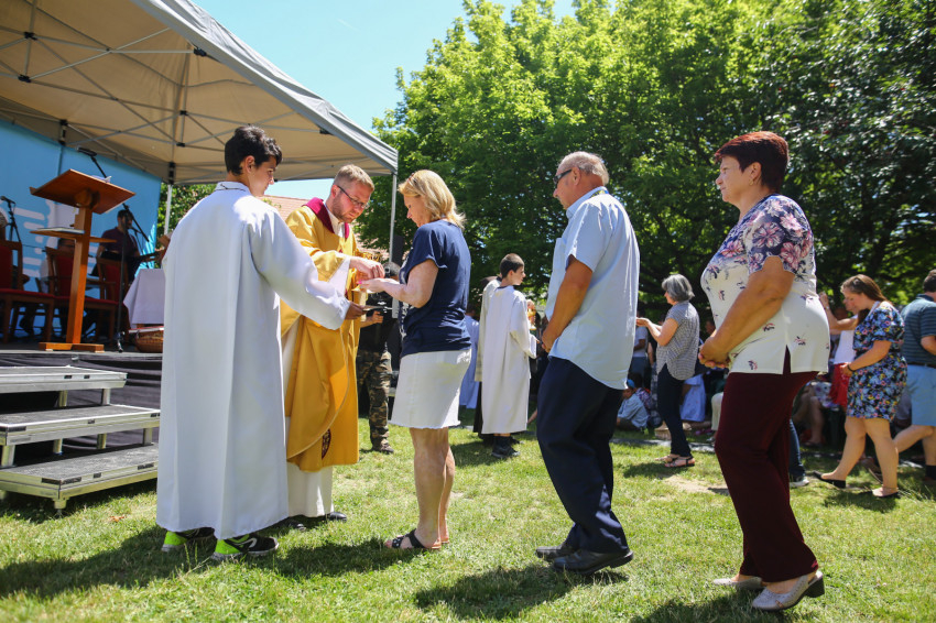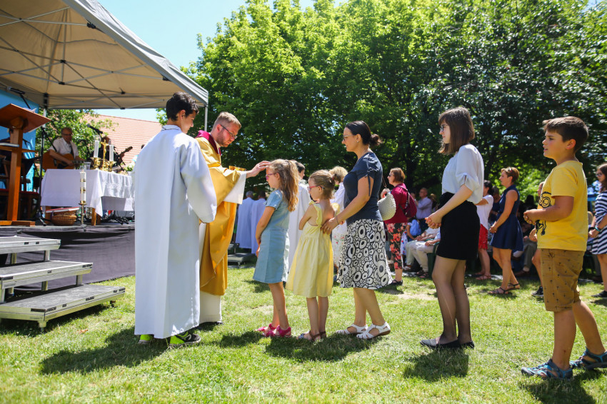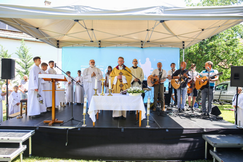 Csókay András tanúságtételét követően Marton Zoltán László szigetmonostori plébános mutatott be koncelebrált szentmisét a kerti színpadon felállított oltár előtt.