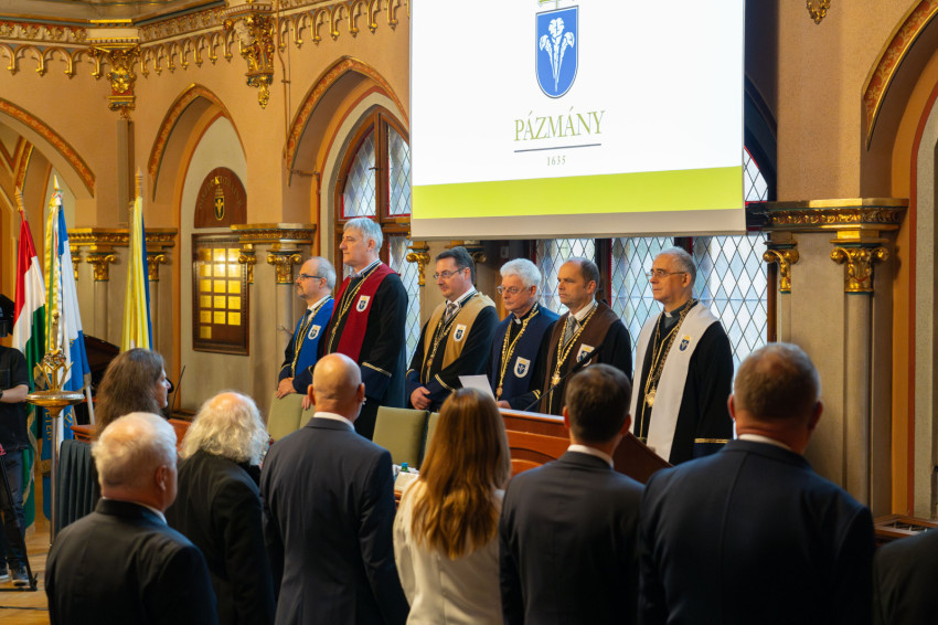 Kuminetz Géza, a PPKE rektora ünnepi beszédében hangsúlyozta: a tudás hatalmas kincse tulajdonosának. Sok mindenre fordítható, közülük az egyik leglényegesebb emberségünk kibontakoztatása. „Egyesek azért tanulnak, hogy sok érdekeset megtudjanak és ez a kíváncsiság. Mások, hogy a tudományból anyagi előnyt húzzanak és ez a kapzsiság. Ismét mások, hogy kitűnjenek, ez a hiúság. Mások, hogy előkészítsék az utat méltóságokba, magas állásokba és ez a becsvágy. Mások, hogy képzettek legyenek, ez az okosság. Végül vannak, akik azért tanulnak, hogy embertársaiknak tudásukkal használjanak és ez a tanulás a szeretet” – idézte gondolatai zárásaként Szent Bernátot Kuminetz Géza.