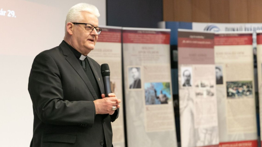 Hogy miért fontos az emlékezés, arra Spányi Antal székesfehérvári megyéspüspök világított rá beszédében. Mint mondta, az ember olyan teremtmény, aki nemcsak emlékezni tud, hanem felejteni is. Viszont ha felejtünk, akkor kitesszük magunkat az ismétlés veszélyének. Legyenek olyan emlékeink, amelyeket szívünkbe zárhatunk, önmagunkat is védve ezzel. Szólt arról is, hogy a mai fiatalok talán már el sem hiszik, amit szüleik, felmenőik elmesélnek nekik a régi idők nehézségeiről. Például hogy volt olyan korszak, amikor nem lehetett templomokat építeni, vagy éppen harangot kongatni, ami ma már szinte elképzelhetetlen. A hitet azért támadják, mert ez fontos támasza az embereknek, hit nélkül pedig bizonytalanokká válunk. Ilyen támaszt jelent a család is mint szent kötelék, akárcsak a haza, a nemzet, amelyek gyökereket adnak nekünk. Ha gyenge, töredezett a gyökér, ingataggá válunk, viszont ha stabil és erős, akkor kibírhatjuk a kibírhatatlant, a megpróbáltatásokat, akárcsak a „Légy hű mindhalálig” tablósorozaton bemutatott egyházi személyek is, akik vállalták küldetésüket, és üdvösségre jutottak.
