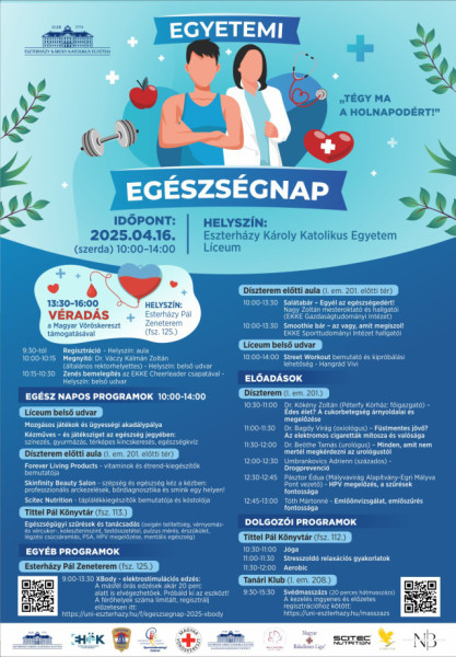Az egyetemi egészségnapon nemcsak látványos sportbemutatók, izgalmas előadások és egészségügyi szűrések várják a Líceumba érkezőket, hanem termékbemutatókkal, masszázzsal, saláta- és smoothie-bárral is kedveznek az egyetemi és városi polgároknak a szervezők.