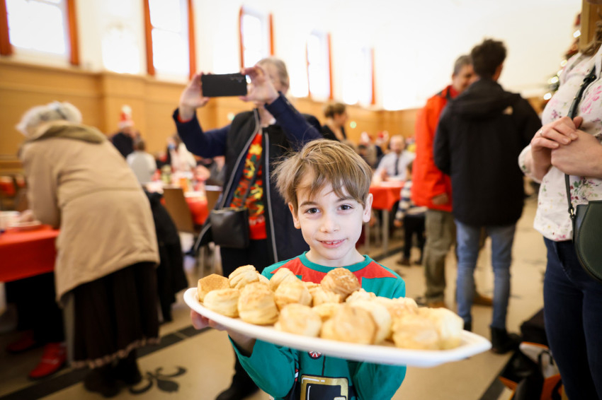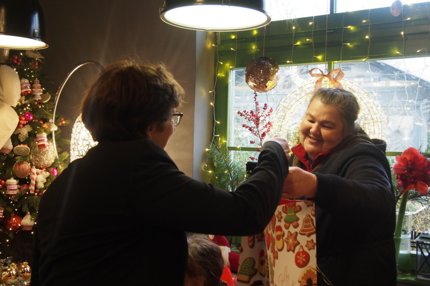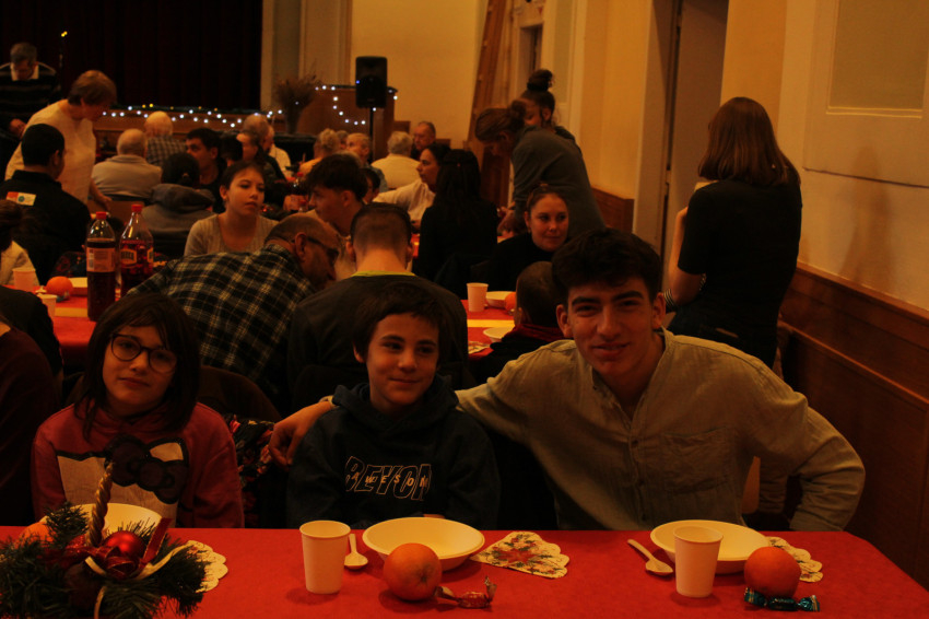 A különleges díszbe öltözött kicsiny helyiségekben a meghívottak úgy érezték, egy karácsonyi mese díszletei közé lépnek be, miután a templomban együtt hallgatták meg a születés örömhírét. Fuvolaszó kíséretében karácsonyi dalokat énekeltek, ezt követően érkezett a finom ebéd, amelynek végén a bisztró süteménnyel is kedveskedett a vendégeknek. A sok gyerek jelenléte különösen vidámmá tette az együttlétet, amelynek végén a 11 éves Kevin születésnapját is megünnepelték.