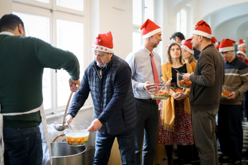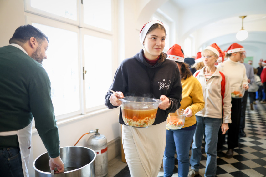 A budai ciszterci gimnázium most először adott otthont a szegények karácsonyi ebédjének. Különösen is köszönet illeti Barlay Bence igazgatót, aki egész családjával együtt fel is szolgált az ebéden. Mint minden önkéntest, őt is egy meghatározott asztalhoz osztottuk be: az ott ülő idősek ámulattal fogadták, hogy a patinás intézmény vezetője hozza nekik az újházi tyúkhúslevest, a töltött csirkét és a bejglit. Megvalósulni látszottak XVI. Benedek és Ferenc pápa szavai: