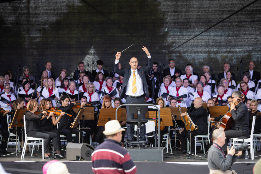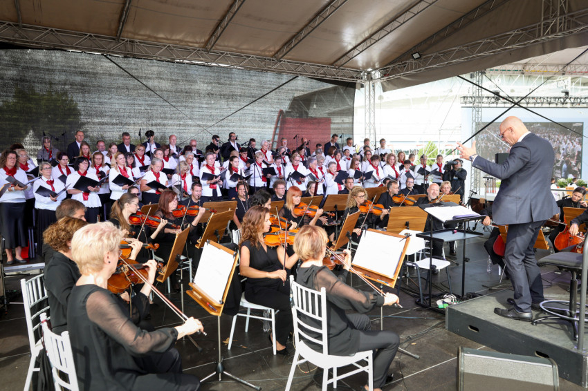 A zenei szolgálatot egy majdnem százfős egyesített ének- és zenekar végezte, melynek része volt a Mendelssohn Kamarazenekar, az Orlando Énekegyüttes, a veszprémi főszékesegyház Szent Mihály kórusa, a veszprémi Regina Mundi-plébánia Schola Regina kórusa és a keszthelyi kármelita bazilika kórusa. A művészeti vezetők Kovács Péter, Vikman Pál, Németh Kristóf, Szamosi Szabolcs voltak. Orgonán közreműködött Kovács Szilárd Ferenc, a pécsi székesegyház orgonaművésze, akinek Werner Alajos Mercedes-mise-átirata is elhangzott.