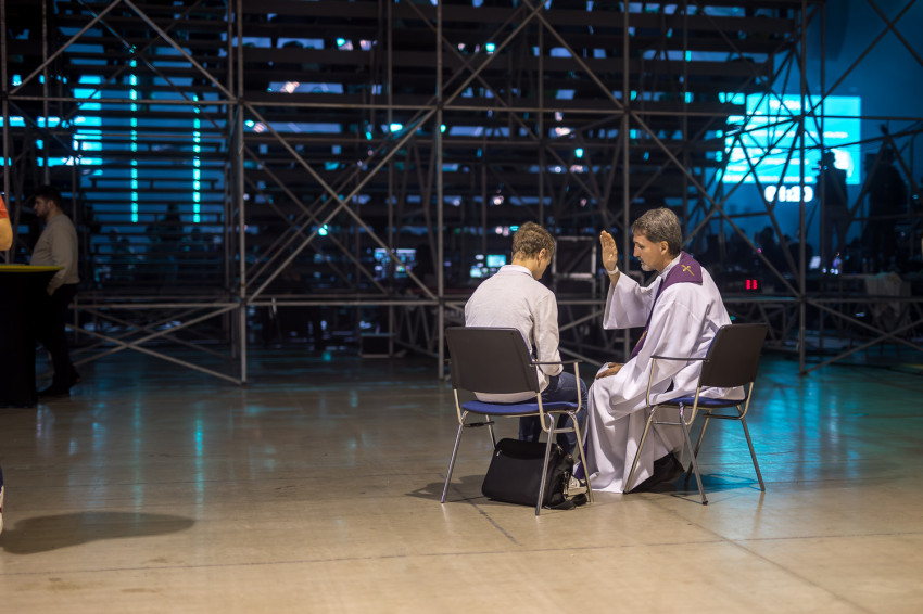 A Forráspont-esten folyamatos lehetőség volt a szentgyónásra, hogy mindenki felkészülhessen a találkozó csúcspontjára, a szentmisére, amelyet Fábry Kornél esztergom-budapesti segédpüspök, az MKPK Ifjúsági Bizottságának vezetője mutatott be Mohos Gábor segédpüspökkel és a koncelebráló papokkal együtt.