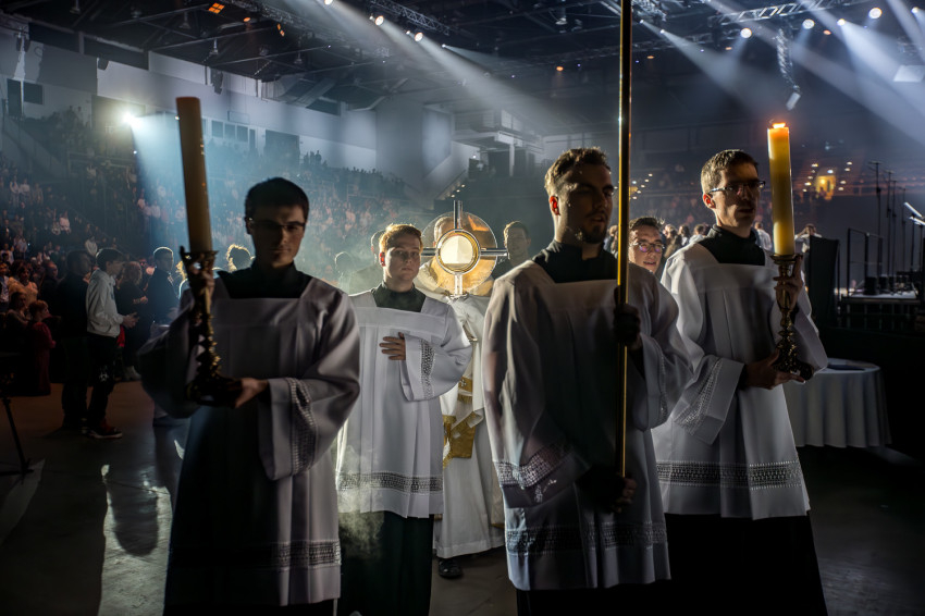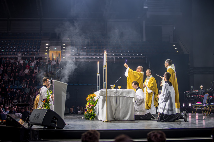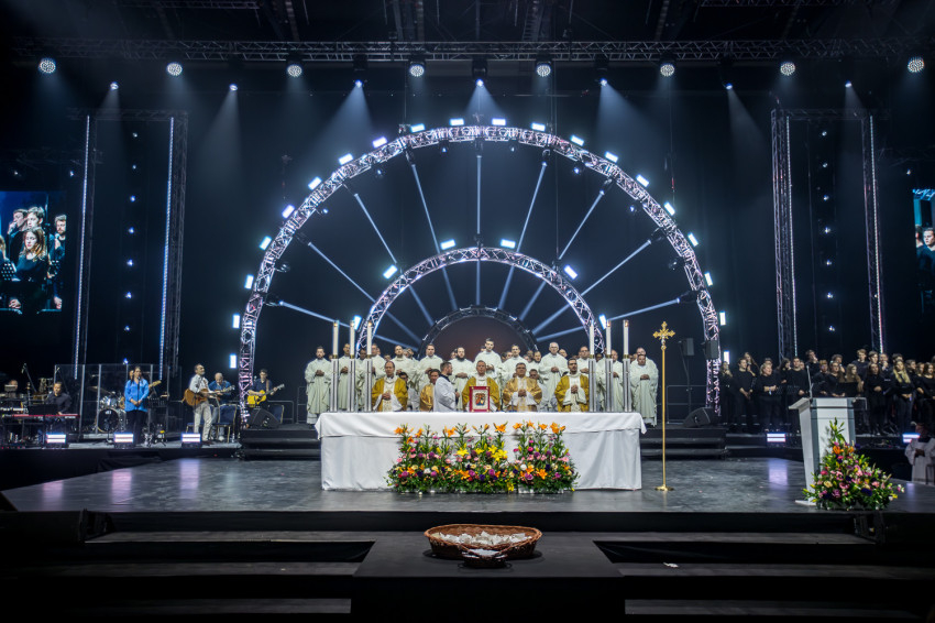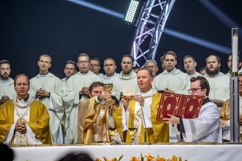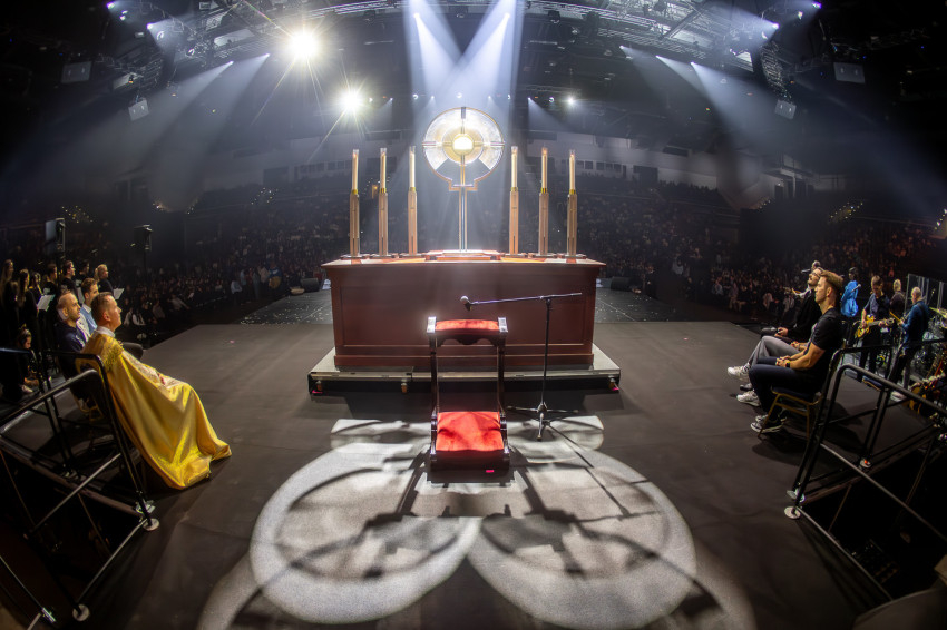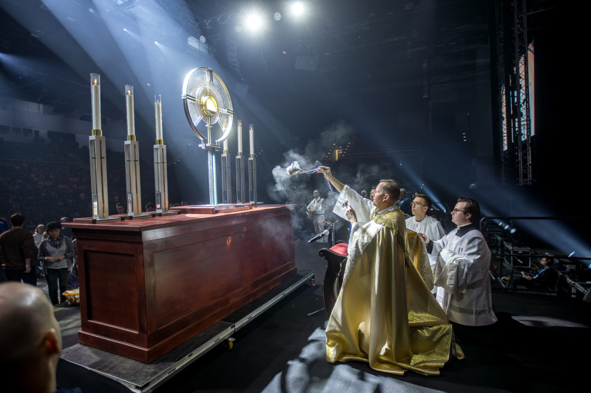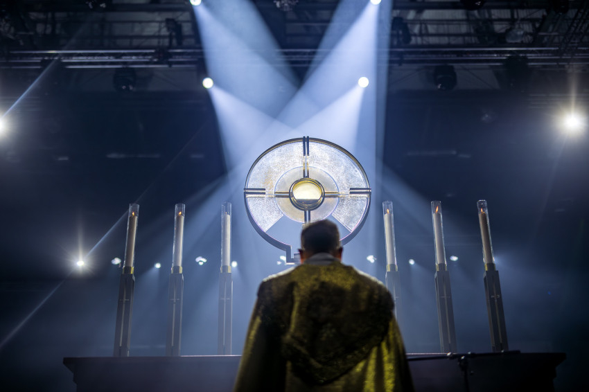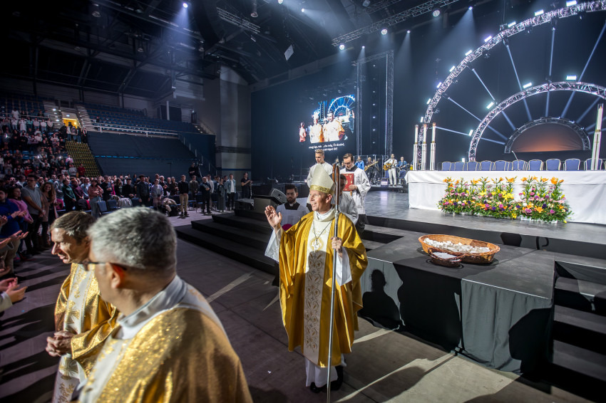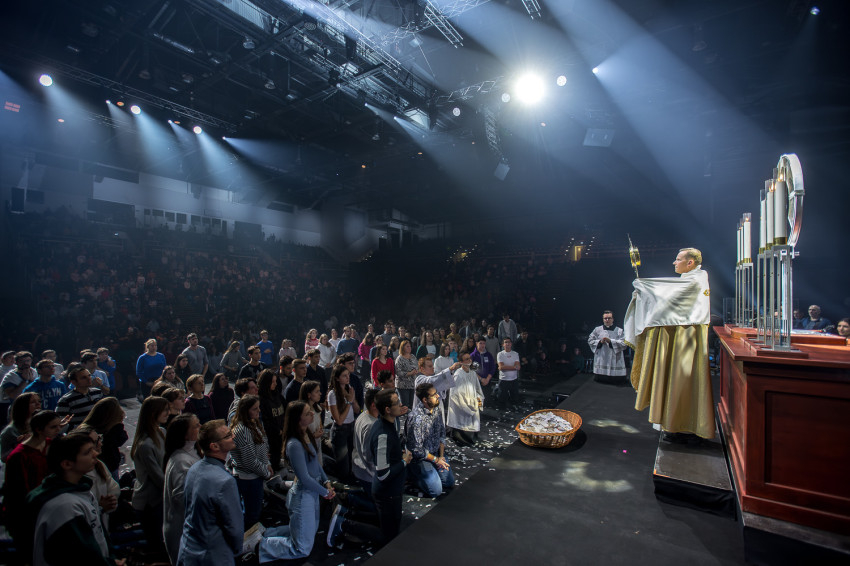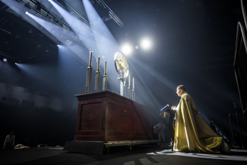 Fábry Kornél püspök a színpad közepén felállított oltárra helyezte az Eucharisztiát. Elkezdődött a szentségimádás. „Áldott légy, Uram, hogy meghívtál a te országodba. Fogadd el életünket, hiszen a teljes életre hívtál meg minket, alakítsd szívünket a te szíved szerint” – imádkozott az esztergom-budapesti segédpüspök.