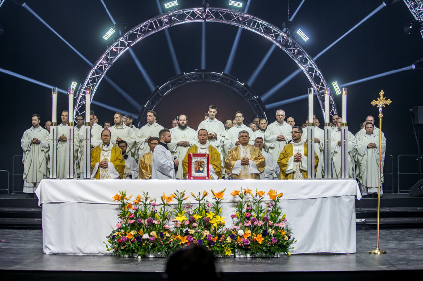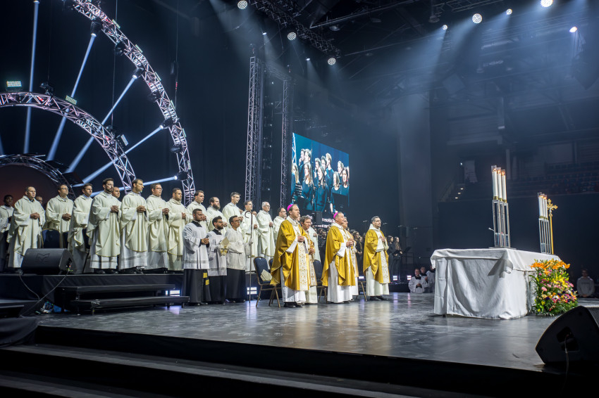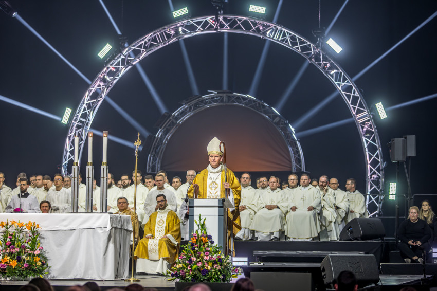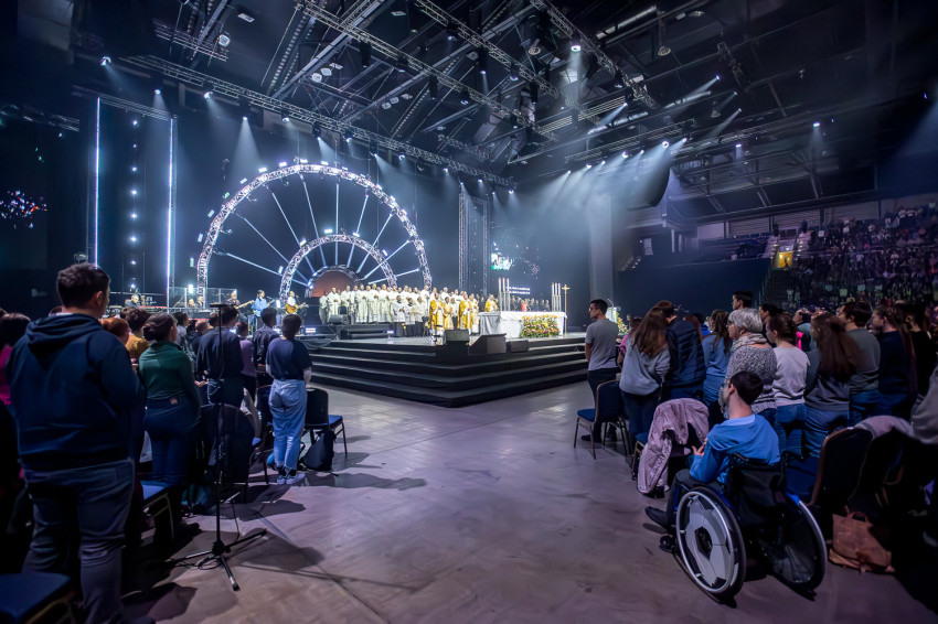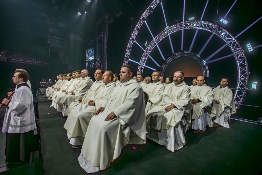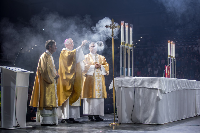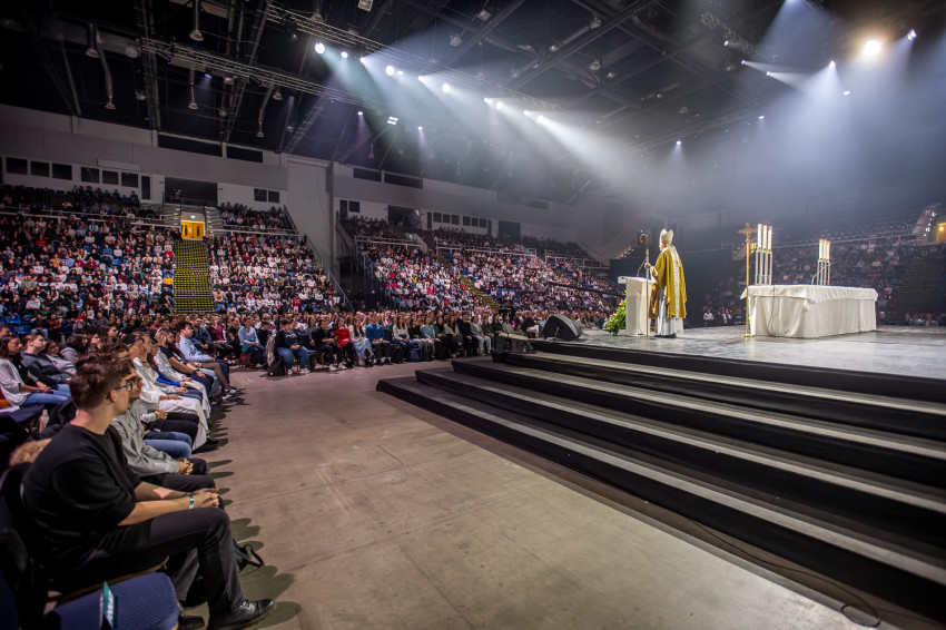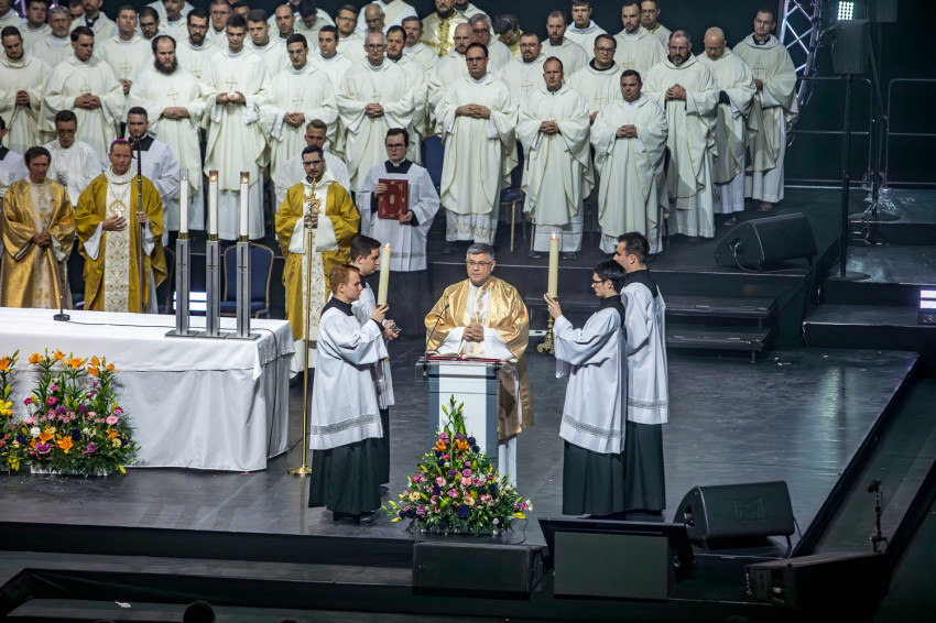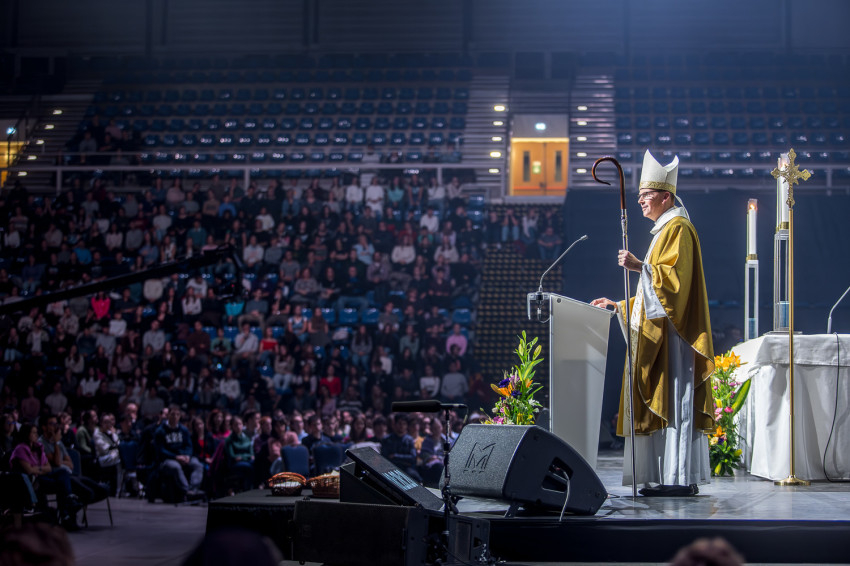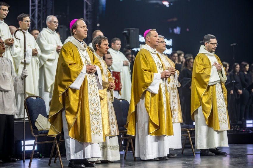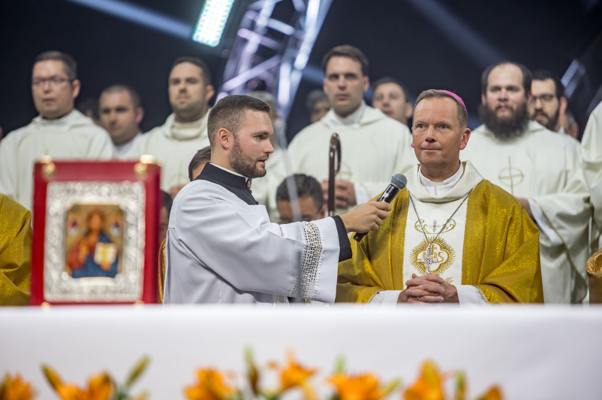 Fábry Kornél püspök a színpad közepén felállított oltárra helyezte az Eucharisztiát. Elkezdődött a szentségimádás. „Áldott légy, Uram, hogy meghívtál a te országodba. Fogadd el életünket, hiszen a teljes életre hívtál meg minket, alakítsd szívünket a te szíved szerint” – imádkozott az esztergom-budapesti segédpüspök.