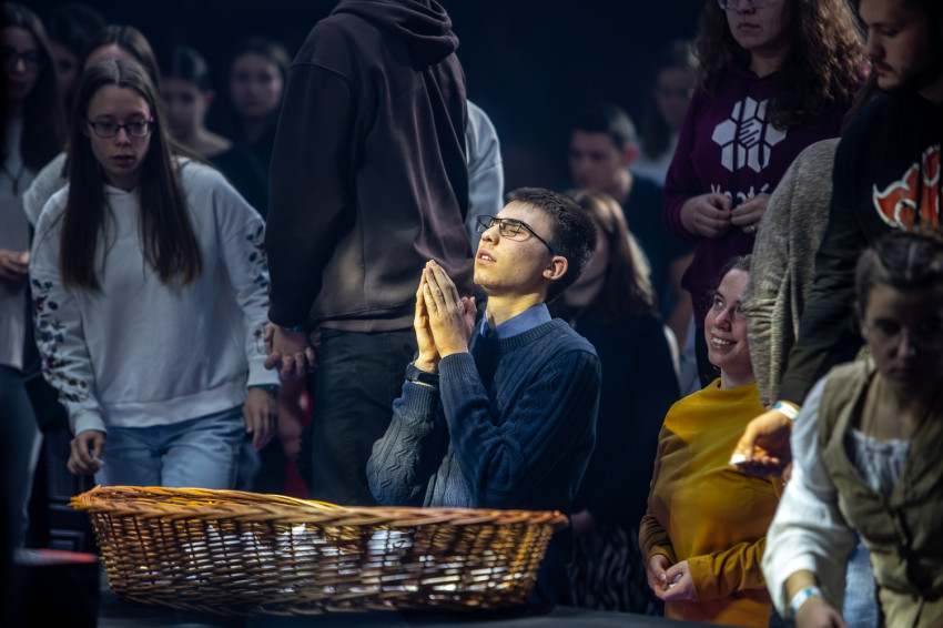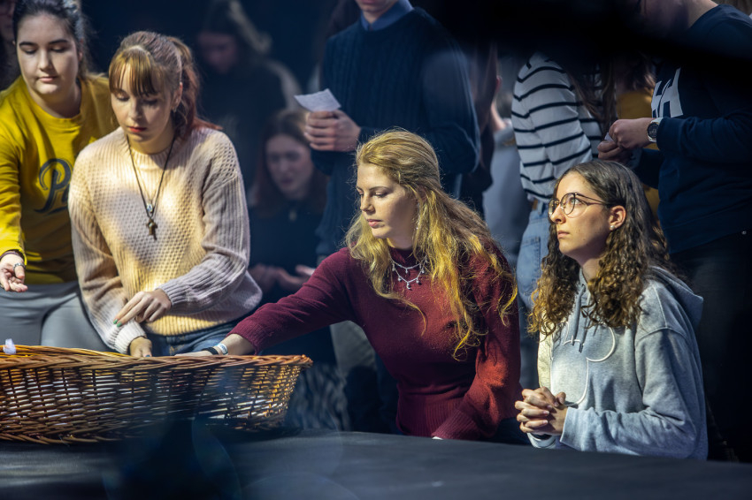 És a fiatalok sorra megindultak, hogy a kosárba kihelyezett papírdarabokra leírják és Jézus elé vigyék, ami a szívükben van: bánatot, kérést, fájdalmat, terheket. Igent mondtak, és barátjukká fogadták Jézust. Ők ma döntöttek – szabadon. Majd ezeket a szándékokat elhelyezték az oltár elé tett kosárba.