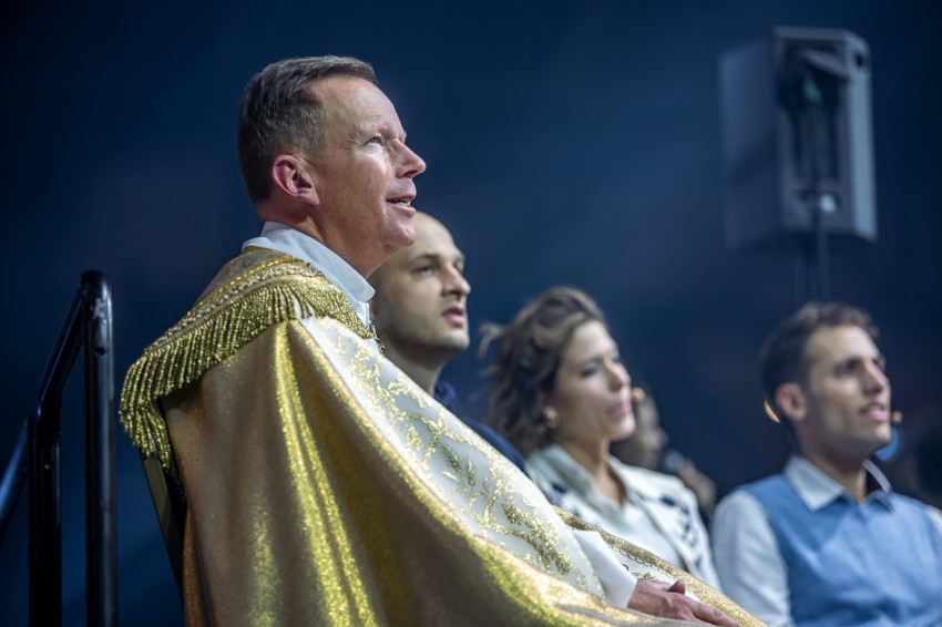 Az aláfestő zene és a fényjátékok, a táncosok gyönyörű mozdulatai által elénk varázsolt drámai előadás végén az asszisztencia az Oltáriszentséggel vonult be.