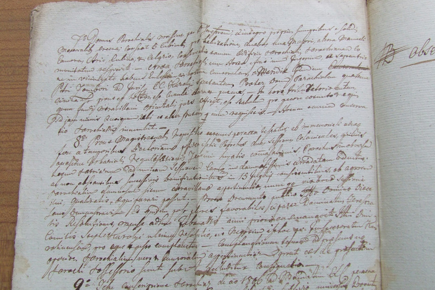2. A templomnak a Báthoryak idejéből két telke van, ehhez értve a kántorét és a harangozóét is, [amelyeket] éppen úgy emberemlékezetet meghaladó idő óta a templomszolgák számára a hozzájuk tartozó kültelkekkel is kiadták, azonban tekintetes gróf Károlyi 1812. évi falubeli bevezetése alkalmával, a szóban forgó részek úrbéri szabályozásakor a kántornak fél telket adtak. A templom [fenntartási] alapját elfoglalták. Ezek szabályozása és a tényleges szabályozás után a cáfolhatatlan érvek alapján bizonyítást nyert, hogy a lefoglalás illegális volt […].
