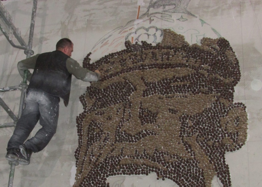 Don Dominik sokáig gondolkodott azon, hogyan tudná a gnjilani iskolaközpontra felhívni az emberek figyelmét. Végül megérlelődött benne egy terv: elkezdte gyűjteni az iskola udvarán a fenyőtobozokat, megtisztította, és vászonzsákokba válogatta őket. Több mint ötvenezer fenyőtoboz gyűlt össze. Diákok segítségével ezekből egy 90 négyzetméteres falfelületre hatalmas mozaikot készítettek, amelyen Teréz anya, Don Bosco és az albán nemzeti hős, Szkander bég portréja látható. Dominik atya számára fontos volt, hogy megmutassa a diákoknak, egy látszólag értéktelen apróságból, fenyőtobozból létre lehet hozni valami nagyot. Az új aulában összesen 51 865 fenyőtobozból hatalmas mű született, amelyet Dominik atya és a diákok az „értékek mozaikjának” neveztek el.
