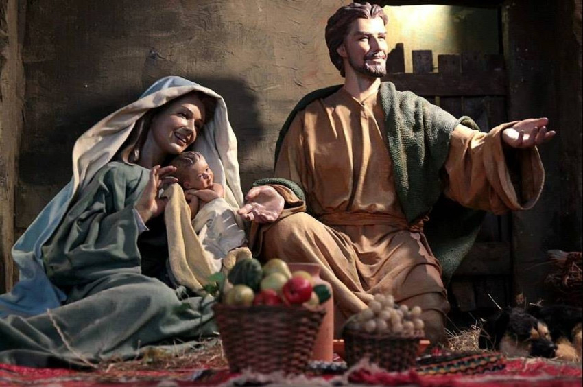 A pásztorok és a három napkeleti bölcs szobrai mellett ott látható a betlehemben Bosco Szent János, Szent II. János Pál pápa, Szent Faustina nővér, Szent Pio atya, Kalkuttai Boldog Teréz anya, valamint Benedek emeritus pápa és Ferenc pápa szobra is. A különleges betlehem hátterében a város panorámája látható.