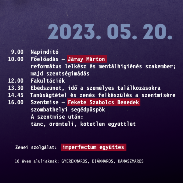 10 óra: főelőadás – Járay Márton református lelkész, mentálhigiénés szakember, az előadást követően szentségimádás