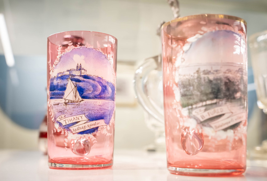 ehhez a témához pedig szorosan kapcsolódnak az úgynevezett fürdőpoharak. Aki pihenni, gyógyulni jött Füredre, annak a fürdőorvos gyógyvizes ivókúrát is ajánlott, amelyhez a pohár tulajdonképpen gyógyászati segédeszköz volt. A helyi kereskedők hamar ráéreztek erre az igényre; biztosan tudjuk, hogy már az 1830-as évektől üvegcsiszoló műhely (később párhuzamosan több is) működött Füreden. Az adott korszak ízléséhez igazodva színben, formában, kialakításban, díszítettségben rendkívül változatos poharak készültek ott. Jellemzőjük, hogy olyan ikonikus épületek képét metszették rájuk, mint a fürdő, a Nagyvendéglő, a kútház, a színház, a Kerektemplom vagy a Horváth-ház; de monogram, dátum és személyes üzenetek feltüntetését is kérhették a megrendelők. A fürdőpoharakat a Semmelweis Orvostörténeti Múzeumból, a Magyar Nemzeti Múzeumból és a Laczkó Dezső Múzeumból kölcsönöztünk.
