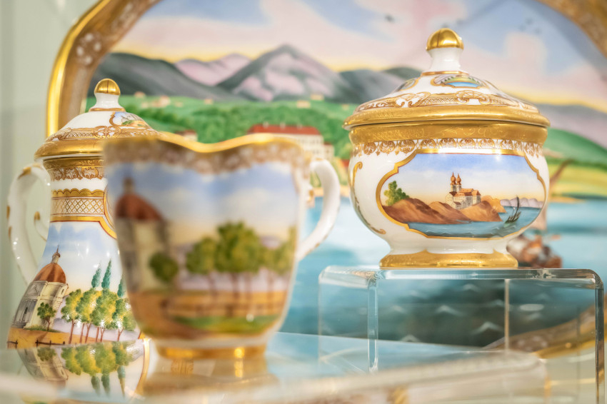 Érdemes még kiemelni egy füredi vonatkozású, gyönyörű miniatúrákat ábrázoló – eredetileg Fischer Mór porcelánmanufaktúrájából való és az Iparművészeti Múzeumban őrzött – kétszemélyes kávéskészlet kiállított másolatát is, amelyet a jogutód Herendi Porcelánmanufaktúra bocsátott a rendelkezésünkre. A cukortartón a tihanyi apátság látható, mutatva a két település szoros kapcsolatát.
