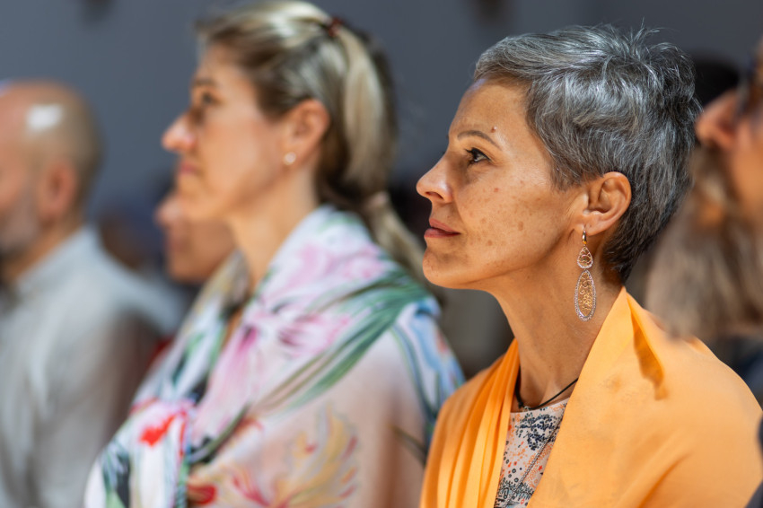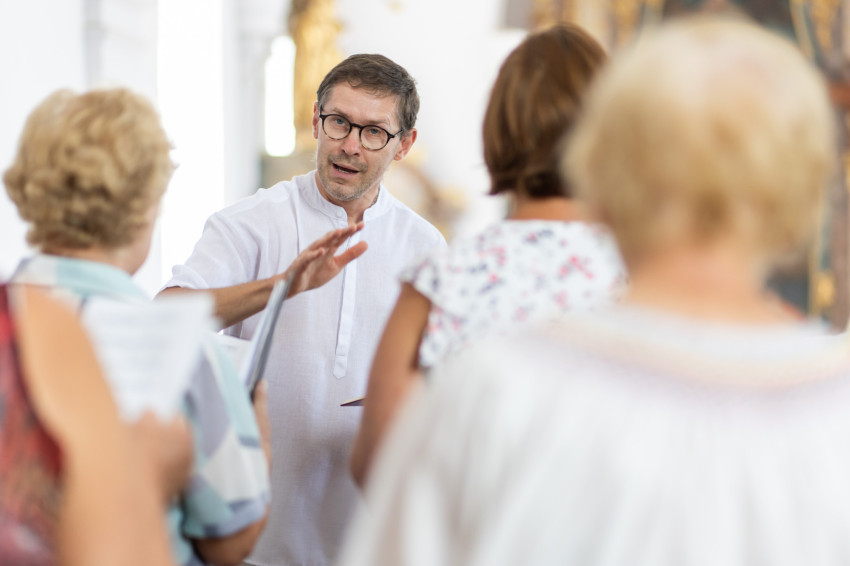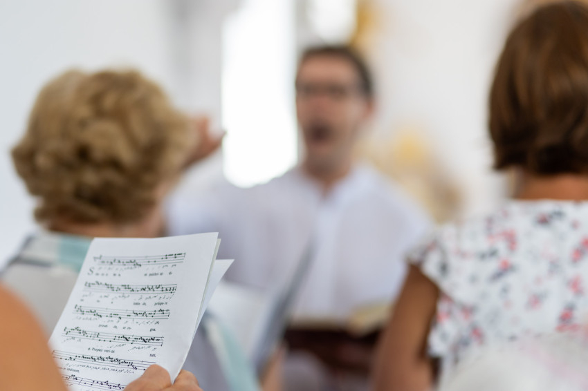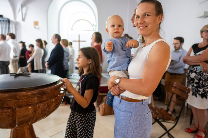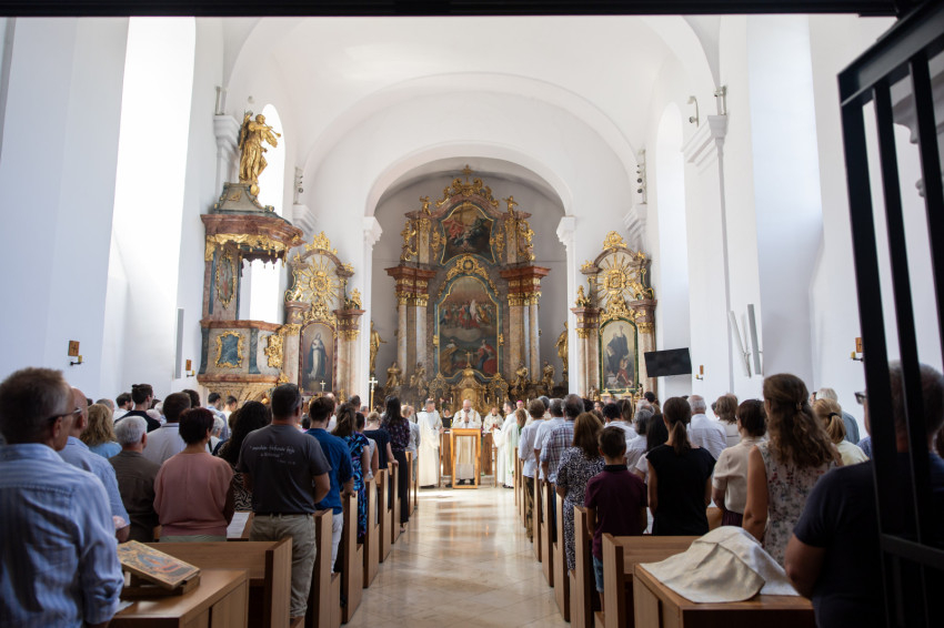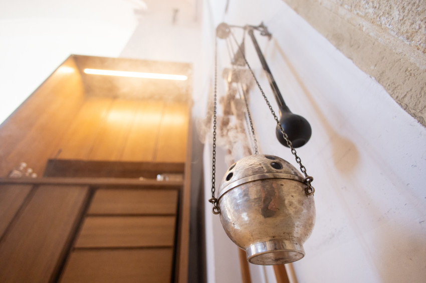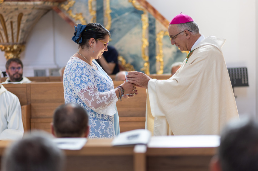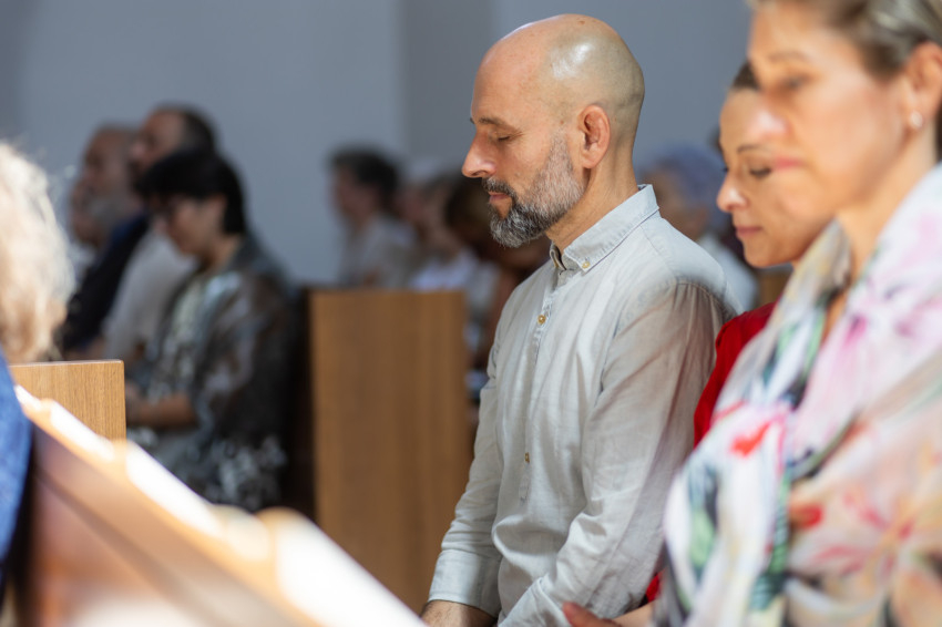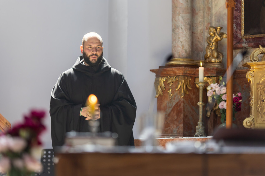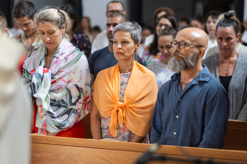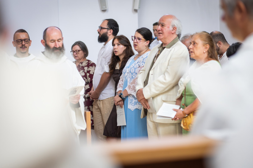 Csendes várakozás a Szent Mauríciusz és vértanútársai templomban. Megteltek a padok, sok vendég érkezett a közösség ünnepére. Testa Jákob testvér tesz ezen a napon örökfogadalmat. A padokon szertartás menetéről tájékoztató füzet, rajta Máriát ábrázoló ikon, Testa Jákob munkája. Az első padban Jákob testvér hozzátartozói. A családtagok és a Comunione e Liberazione közösség tagjai Rómából érkeztek az ünnepre, Jákob testvér szülővárosából.