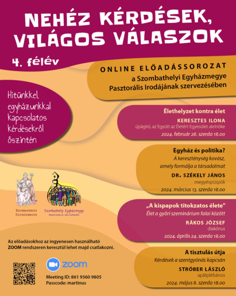 Az előadás témájához kapcsolódó kérdéseinket előre is elküldhetjük a pasztoralis@martinus.hu címre. Ezekre az előadás végén válaszol majd Székely János szombathelyi püspök.