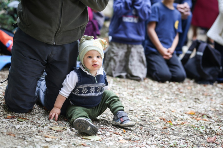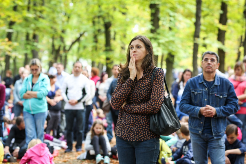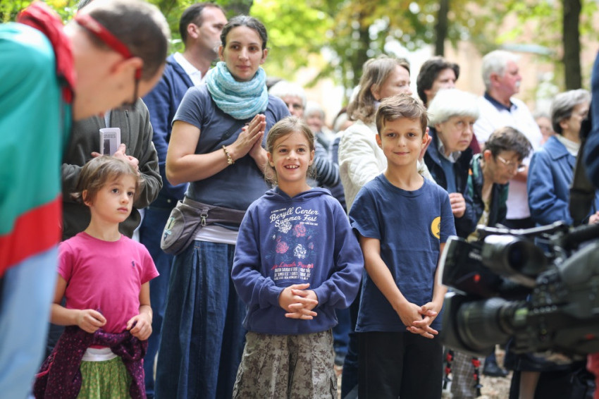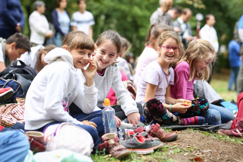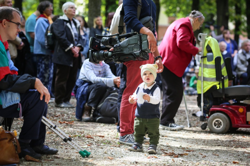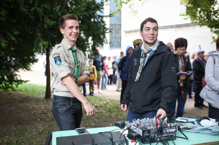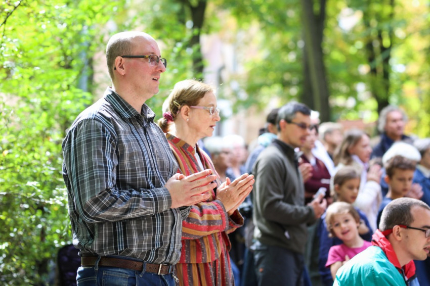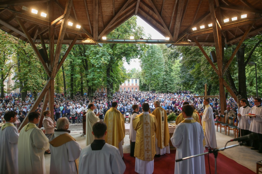 Az ünnep csúcspontja a szentmise volt. Erdő Péter főcelebráns mellett számos paptestvér állt a szabadtári oltár körül. Megteltek a kerti padok, a templom padjai, a diákok pedig földre terített pokrócokon, kabátokon ülve vettek részt a szentmisén.