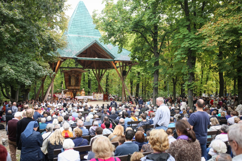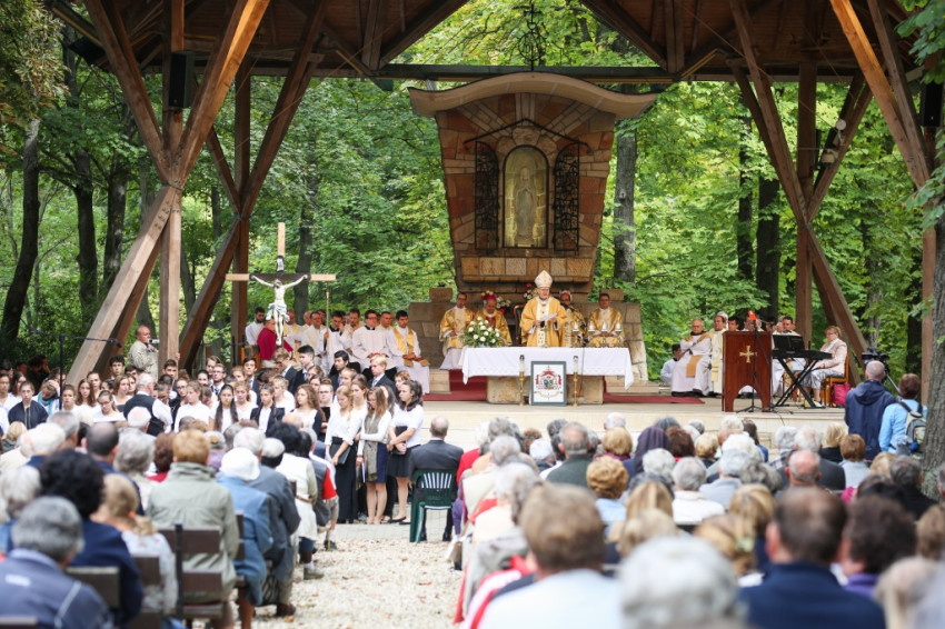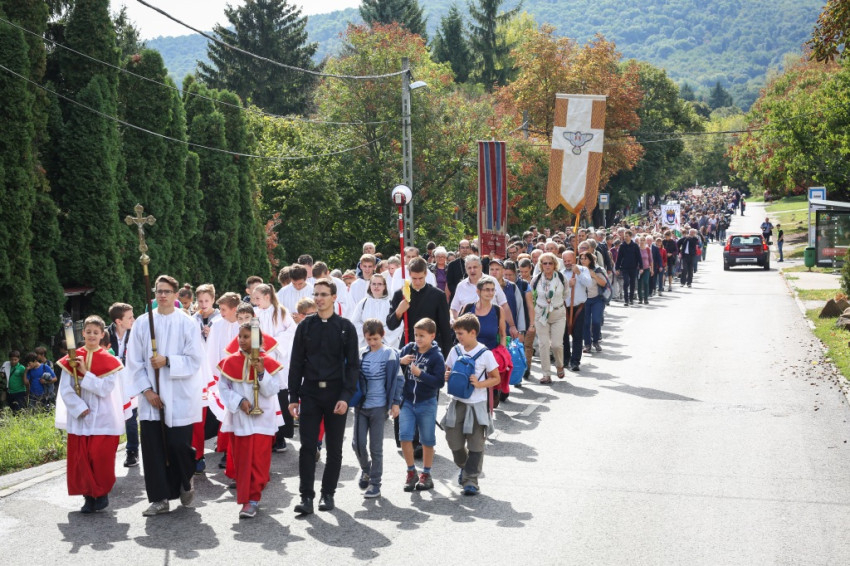 Dél körül, gondolatokkal, imával, énekkel és sok baráti beszélgetéssel érkezett a zarándokmenet a Remete-hegy és a Hosszú-Erdő-hegy közötti szurdokvölgyön át a kegyhelyhez.