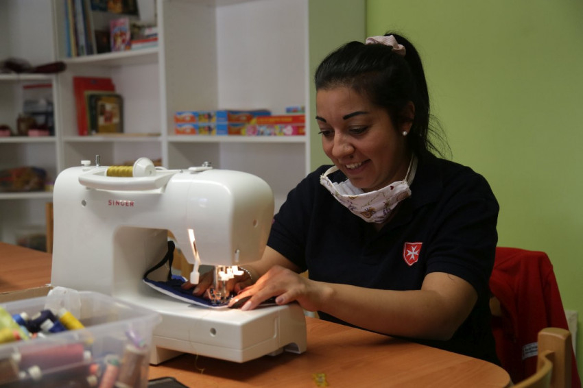 A foglalkozások helyett most a varrógépektől zajos a ház. A pécsi Jelenlét program munkatársai többször használható, mosható maszkokat készítenek a munkatársaiknak és az intézményeikben gondozott embereknek. Farkas Laura, a munkaerőpiaci program koordinátora a maszk varrása közben arról mesél, hogy
