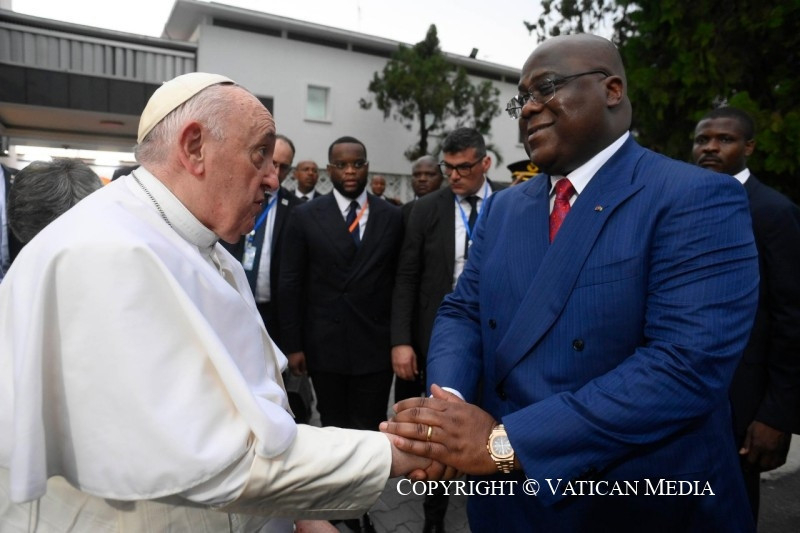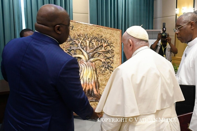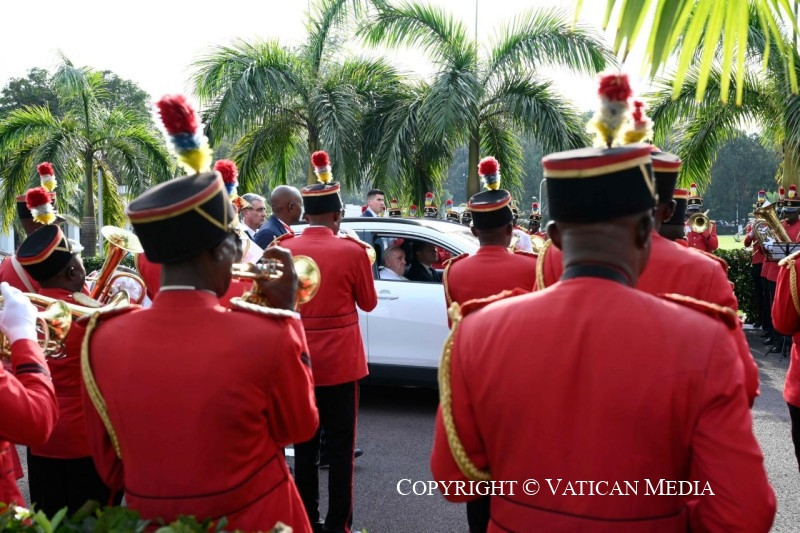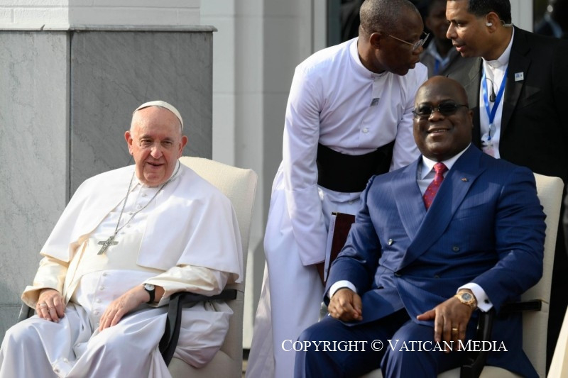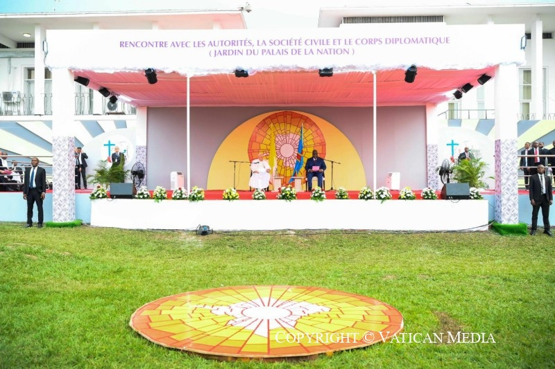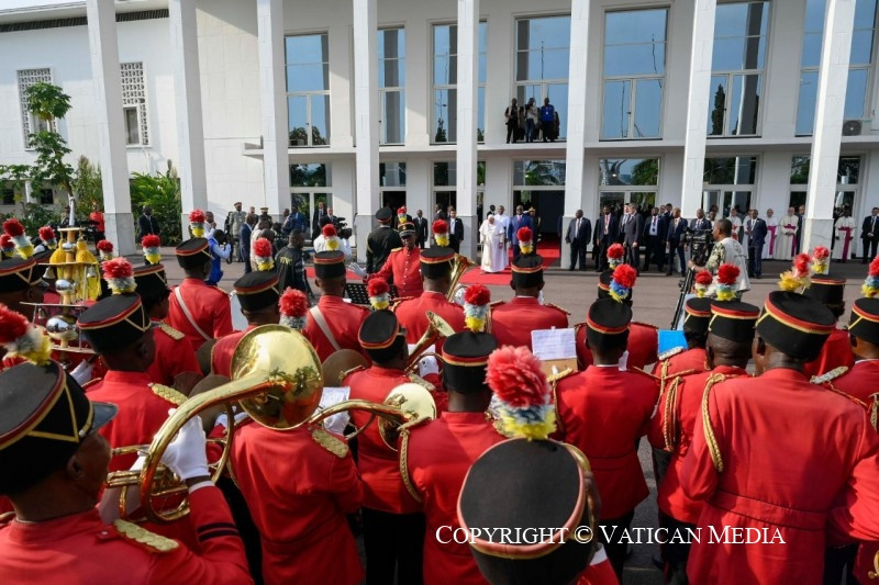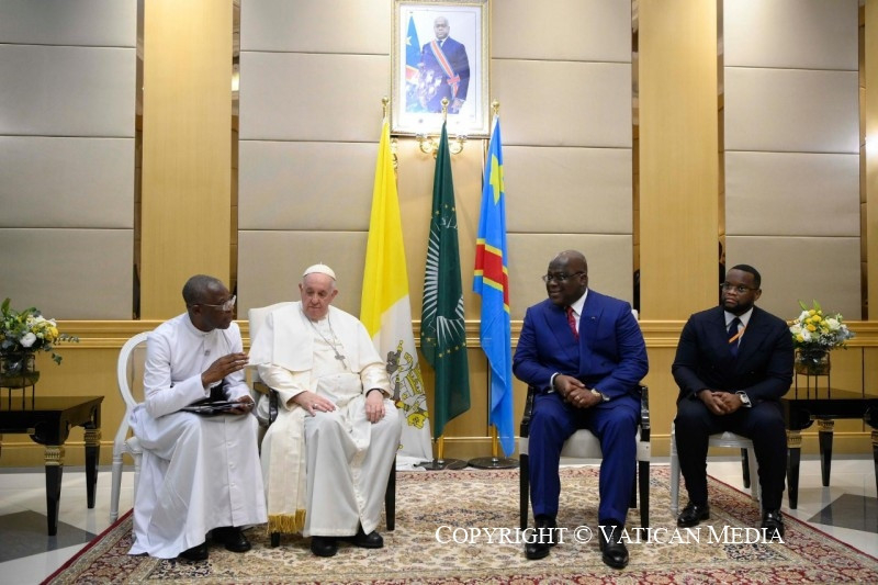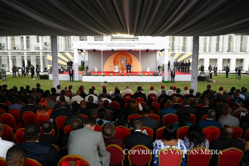 Szeretettel üdvözlöm Önöket, és köszönöm Őexcellenciája, az elnök úr kedves szavait. Örülök, hogy itt lehetek ezen a gyönyörű, hatalmas és gazdag földön, amely északon magában foglalja az egyenlítői erdőséget, középen és dél felé a fennsíkokat és az erdős szavannákat, keleten a dombokat, hegyeket, vulkánokat és tavakat, nyugaton pedig a nagy víztömegeket, az óceánba ömlő Kongó folyóval. Országukban, amely olyan, mint egy kontinens Afrika nagyobb kontinensén belül, úgy tűnik, hogy az egész föld lélegzik. Bár ennek a zöldellő tüdőnek a földrajza oly gazdag és változatos, történelme nem volt hasonlóan áldott.