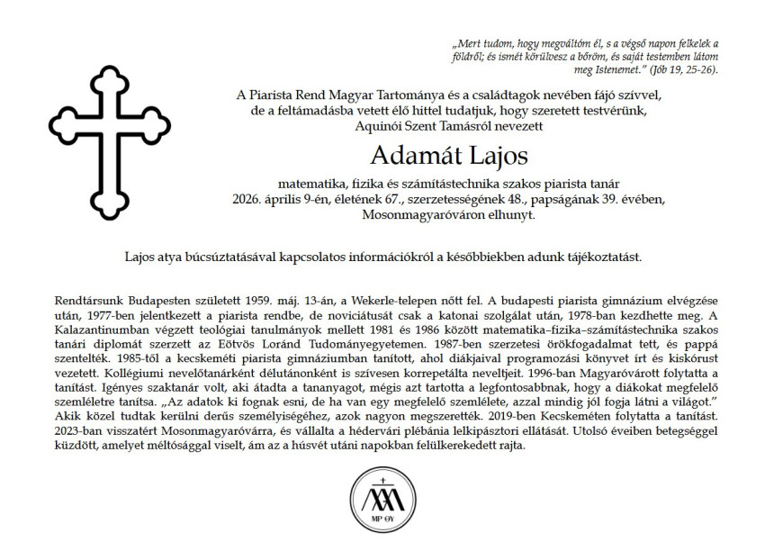 Végül Nyerges-Zombó Katalin, a Mosonmagyaróvári Piarista Iskola főigazgatója búcsúzott a tantestület nevében. Kiemelte: Adamát Lajos összetett, mély személyiség volt, akit nem volt könnyű elsőre megérteni, de közvetlensége, elkötelezettsége és belső derűje maradandó nyomot hagyott mindenkiben. A tudományok és a zene világában egyaránt otthonosan mozgott, és életpéldájával bizonyította, hogy a valódi értékek csendben hatnak tovább.
