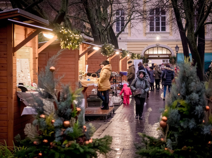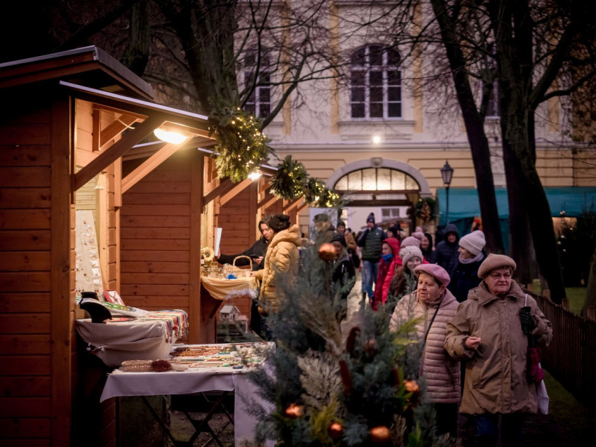 A püspöki palota gyönyörűen feldíszített udvarán, a karácsonyi faházakban megnyílt a kézművesvásár a Fehérvári Kézművesek Egyesülete szervezésében, és helyet kaptak a jótékonysági gyűjtések is a Karitász és a Gyermekvédelmi Központ sátrában.