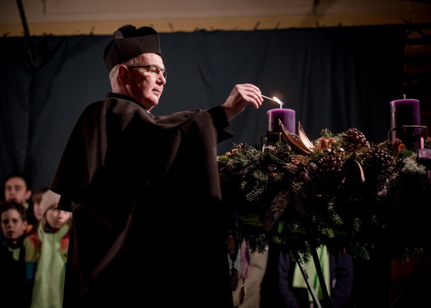 Az adventi udvar első gyertyagyújtásának zárásaként Ugrits Tamás helynök megáldotta a családok koszorúját és a püspökség ajándékát, a családok adventi gyertyáját.