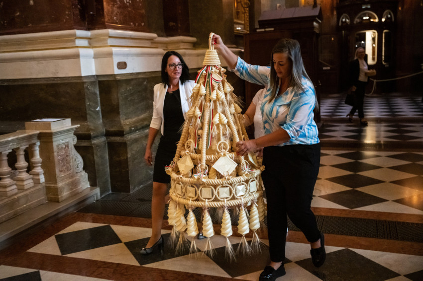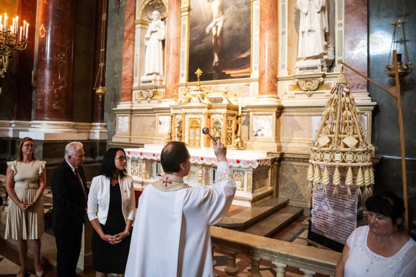 Az aratókoszorút Mohos Gábor esztergom-budapesti segédpüspök, a Szent István-bazilika plébánosa vette át, aki imádságban kérte a Jóisten áldását, majd a könyörgést követően áldást mondott az aratókoszorúra.