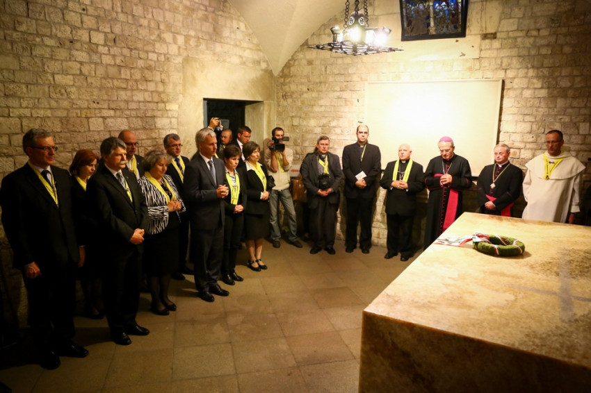 A zarándoklat vezetői és a jelen lévő Kövér László házelnök, Soltész Miklós egyházi, nemzetiségi és civil társadalmi kapcsolatokért felelős államtitkár, valamint Gyurcsík Iván varsói magyar nagykövet megkoszorúzta az öt éve, a szmolenszki légi katasztrófában elhunyt Lech Kaczyński államfő és felesége sírját.