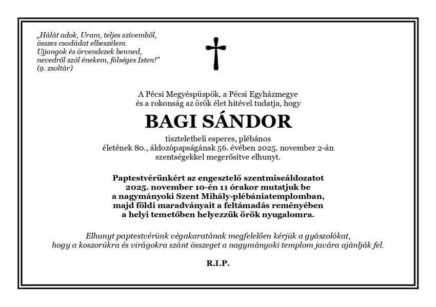 Bagi Sándor 1946. szeptember 10-én született Vállajon. Pécsen szentelték pappá 1970. június 21-én. Előbb káplánként Himesházán, Siklóson és Dombóváron szolgált, majd plébános volt Györén, Szászváron, Pakson, Faddon és 2012 augusztusától haláláig Nagymányokon.