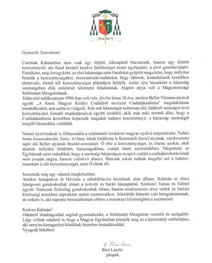 Bíró László nyugalmazott tábori püspök, a Magyar Katolikus Püspöki Konferencia korábbi családreferens tagjának üzenetét az alábbi képre kattintva olvashatják.