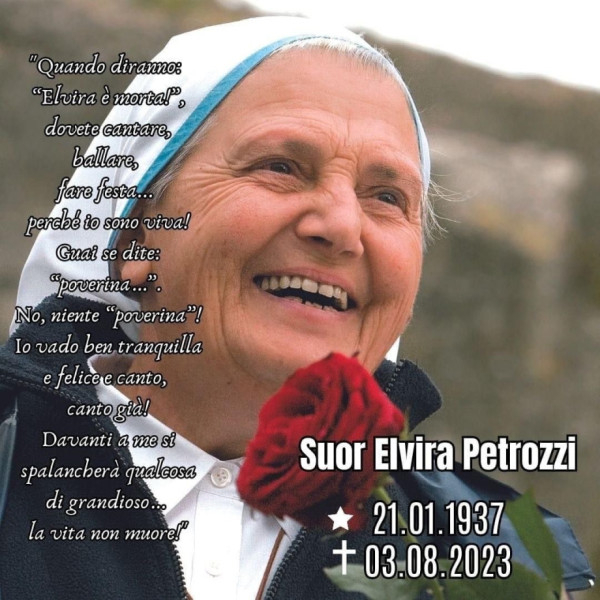 „Amikor azt mondják majd: »Elvira meghalt!«, énekeljetek, táncoljatok, ünnepeljetek, mert én élek! Jaj nektek, ha ezt mondjátok: »szegény meghalt«. Nem, nem szegény! Mert én békében és boldogan énekelve megyek el, énekelve... Közben előttem megnyílik valami óriási titok.. Az élet nem halhat meg!” – Elvira Petrozzi nővér, akit Elvira anyaként ismertek, ezekkel a szavakkal – amelyeket éveken át ismételgetett – készítette fel munkatársait és az általa alapított Cenacolo közösség fiataljait az örök életbe való átmenetére.