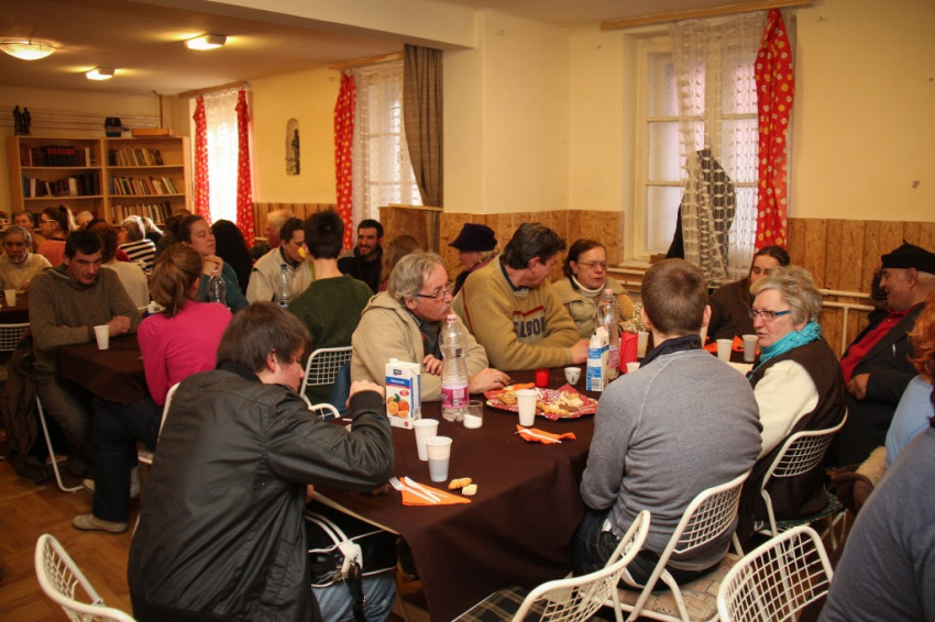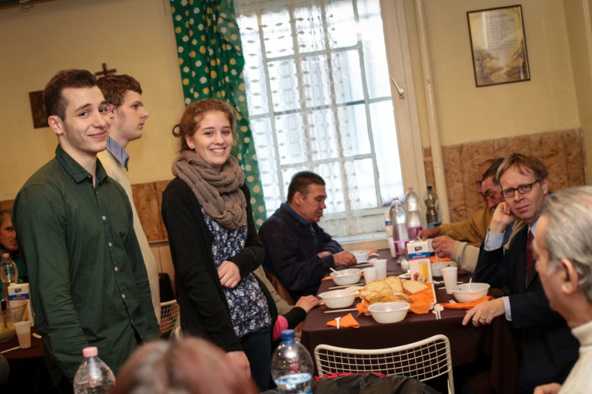 A szentmise előtt a Szent Egyed közösség ebédre hívta szegény barátait a templom plébániáján. Igazi vasárnapi ebéd volt, terített asztalnál, családias légkörben, a Loyola Café konyhájának, valamint a közösség fiatal tagjainak és önkénteseinek köszönhetően, akik többek között a Szent Imre-, a Szent Gellért- és a Ward Mária-gimnáziumokból érkeztek.