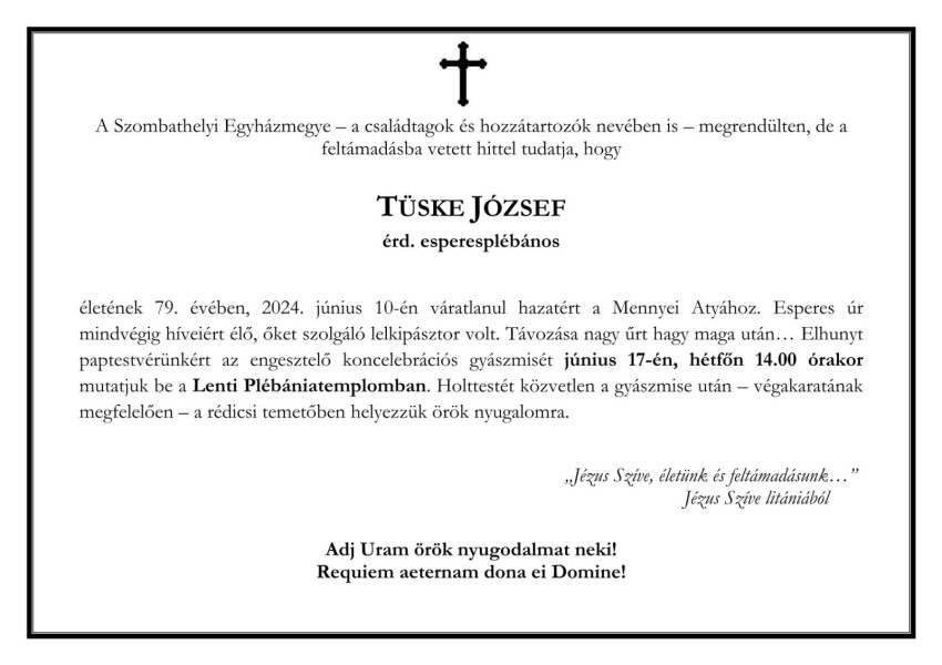 A mindvégig híveiért élő, őket szolgáló lelkipásztor lelki üdvéért koncelebrált engesztelő gyászmisét mutatnak be június 17-én, hétfőn 14 órakor a lenti Szent Mihály-plébániatemplomban.