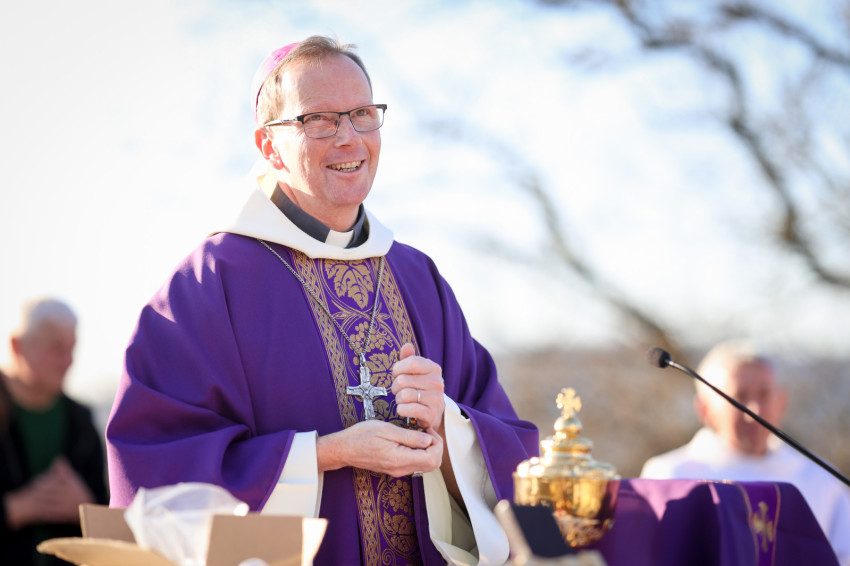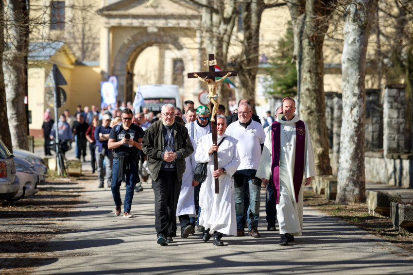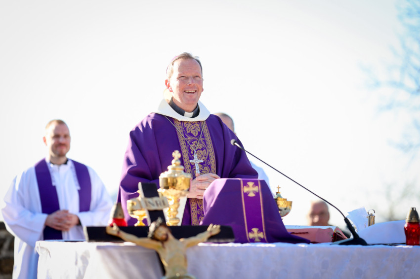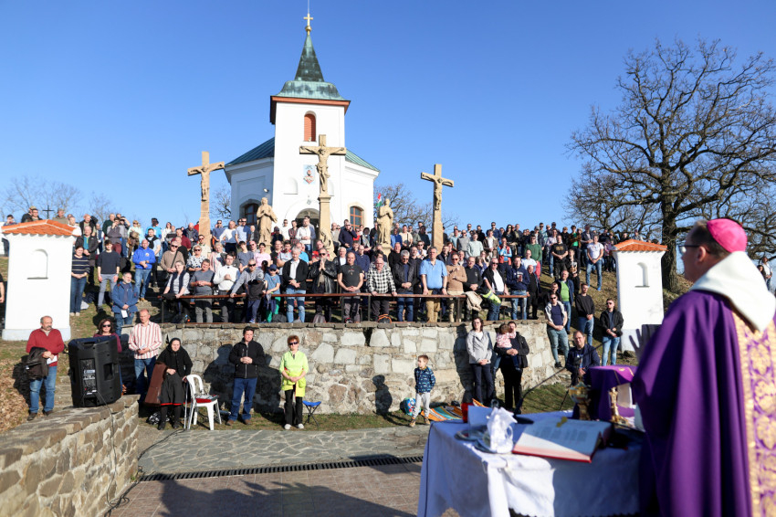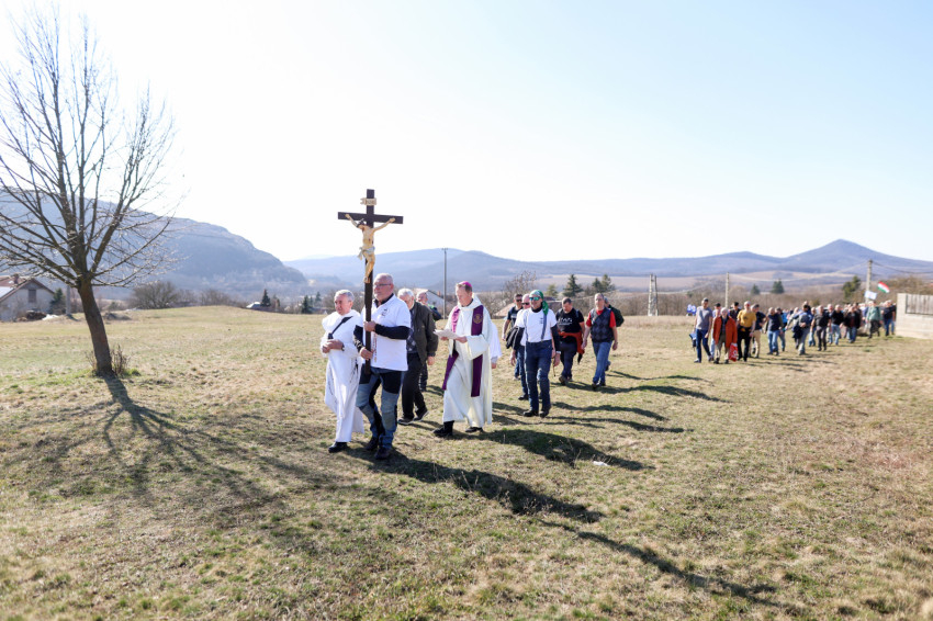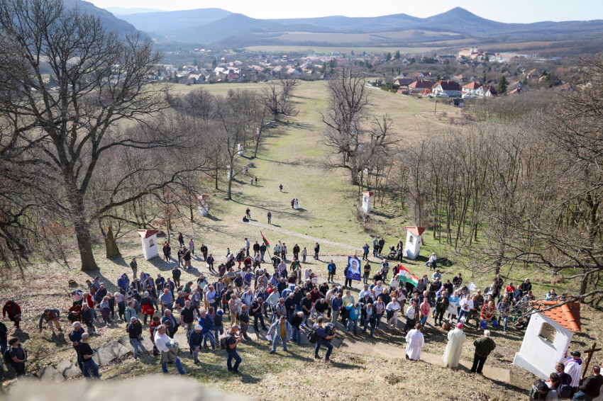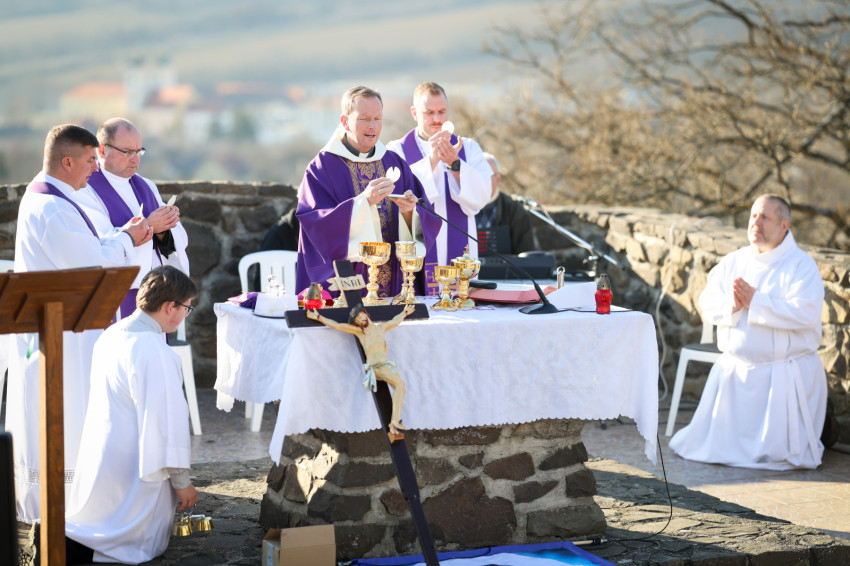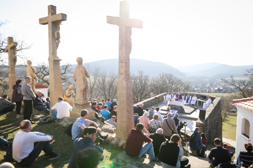 A program a kálvária keresztúti állomásainak végigjárásával folytatódott, majd a hegytetőn bemutatott szentmisén Fábry Kornél püspök a tékozló fiú evangéliumi történetét állította a középpontba. Rámutatott, hogy a példabeszéd szereplőiben – legyen szó a válaszút előtt álló fiúról vagy az irgalmas atyáról – saját életállapotunkra ismerhetünk rá. A püspök beszédében kiemelte: személyes megújulásunk, az életszentség nem egy távoli, elérhetetlen ideál, hanem a mindennapok következetes döntéseiben dől el. Mindennap újra meg kell erősítenünk Istennek tett ígéretünket. Fábry Kornél hangsúlyozta, hogy