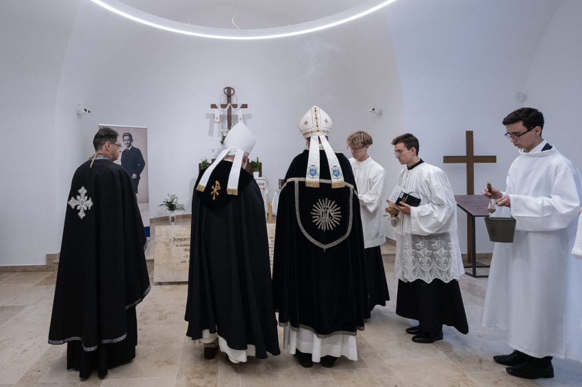 A szentmise végén a Premontrei Iskolaközpont diákjai levonultak az altemplomba, hogy leróják imádságos kegyeletüket száz évvel korábban élt iskolatársuk előtt.