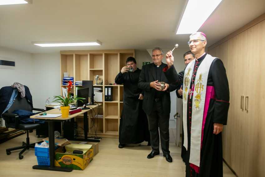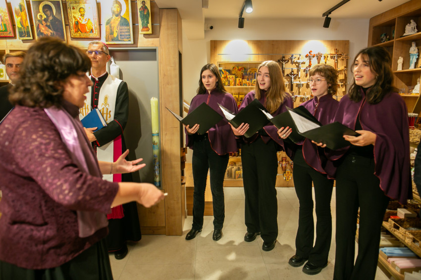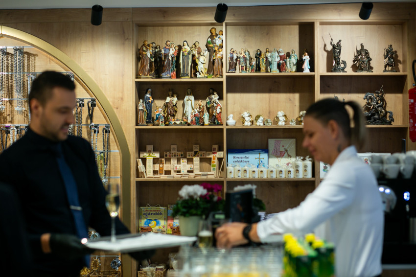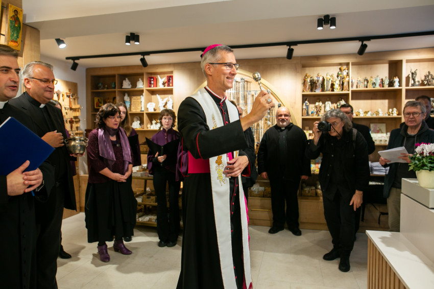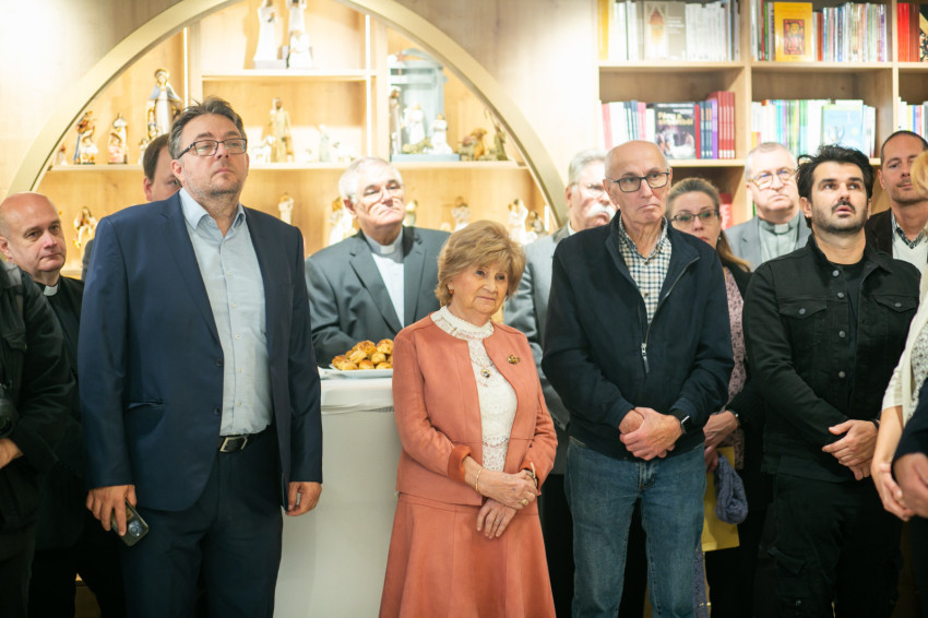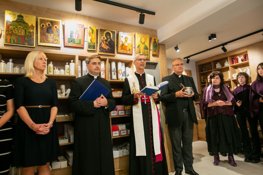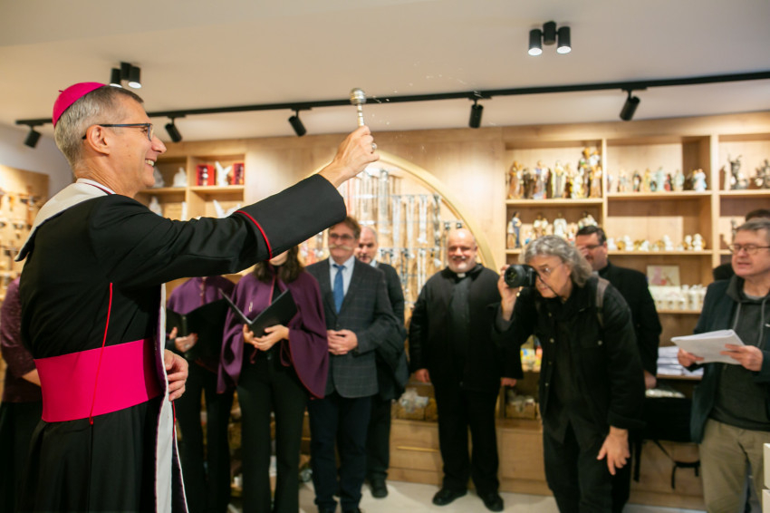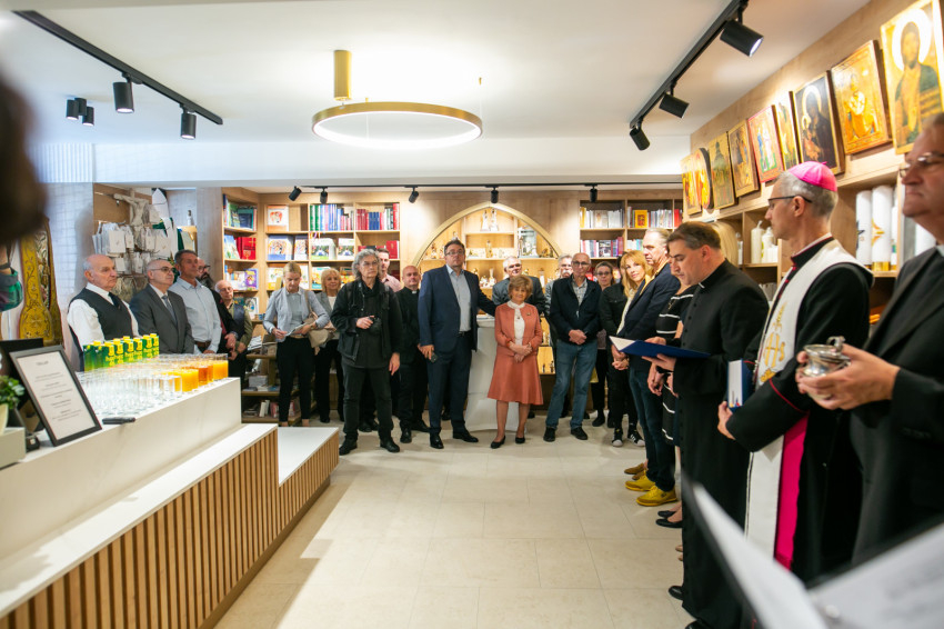 A Miatyánk és az Üdvözlégy elimádkozását követően Martos Levente Balázs püspök megáldotta a megújult kegytárgy- és könyvesboltot.