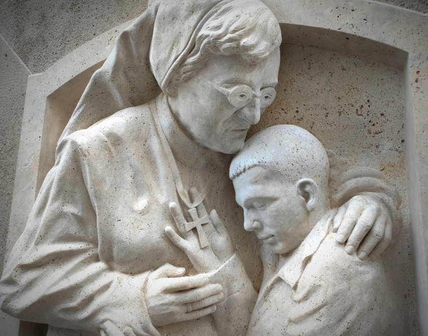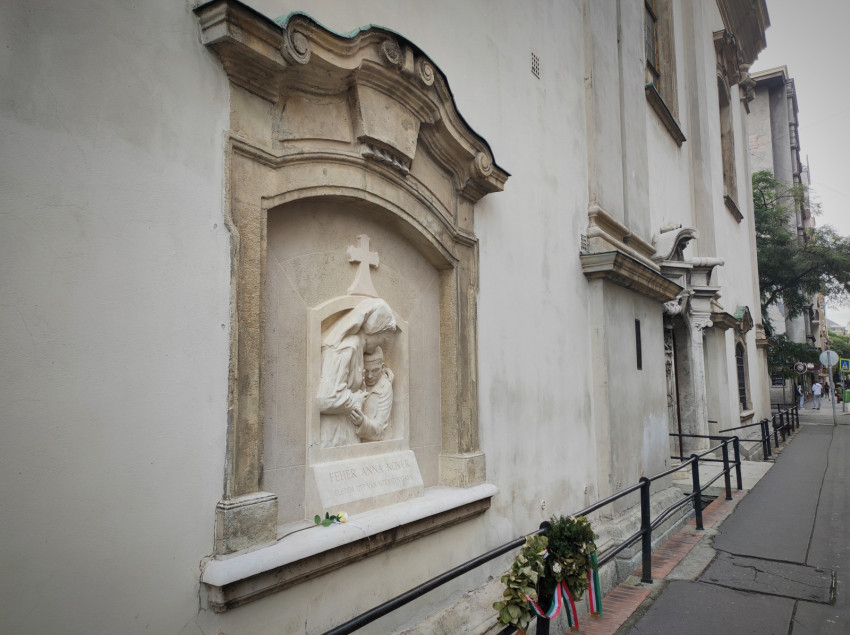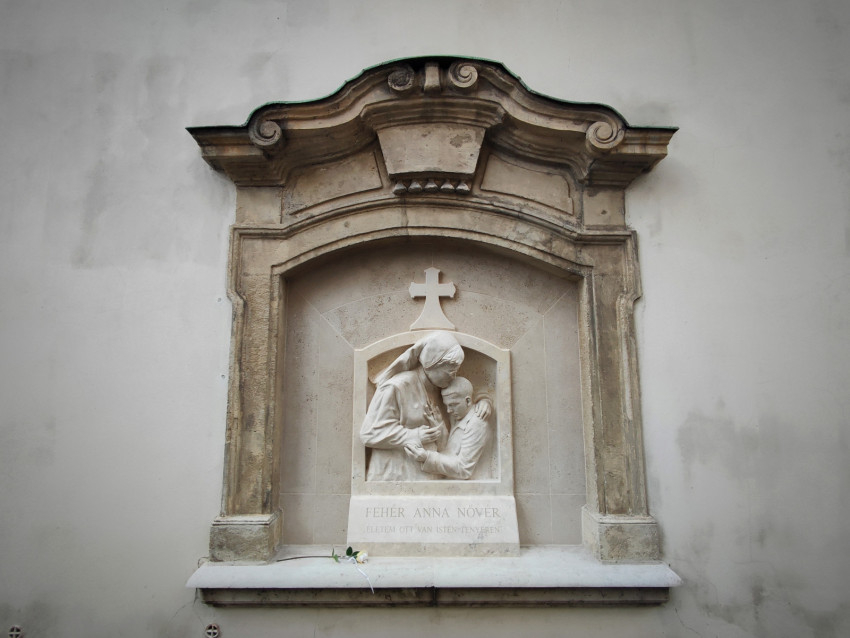 Párkányi Raab Péter Kossuth-díjas szobrászművész mészkőből készített domborműve a Szent Anna-templom barokk kori vakablakában kapott helyet. Anna nővért egyik kis védencével ábrázolja, ahogyan élete során is gyakran lehetett őt látni.