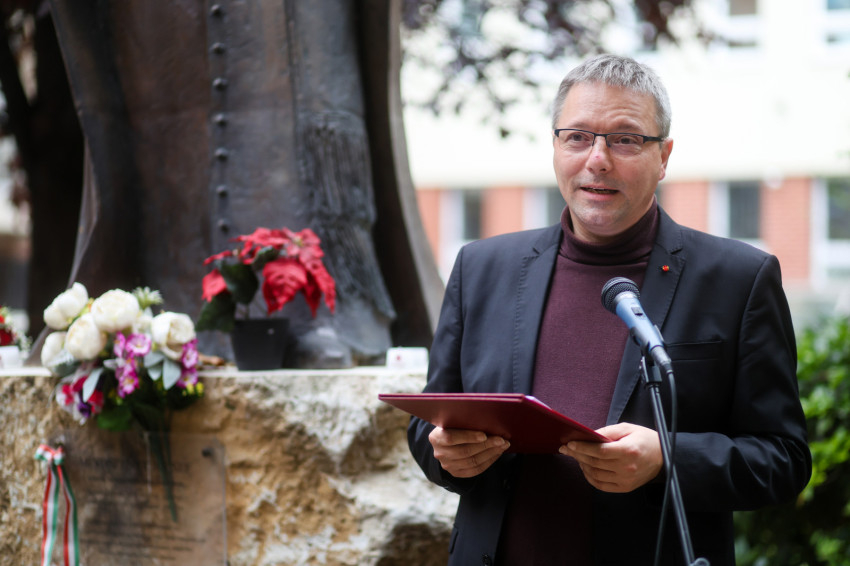 Kovács Gergely alapítványi képviselő '56 örökségére emlékeztetett. „1956-ot máig igazán se kiköpni, se lenyelni nem tudja Magyarország” – utalt a közelmúlt vitáira, hogy divat lett Nagy Imre ócsárolása, és lejártó könyv készül Mindszenty József bíboros ellen. Nem fog sikerülni. Most temettük a rendszerváltás utolsó nagy alakját, Sólyom Lászlót, aki nem azért nem tüntette ki Horn Gyulát, mert kommunista volt, hanem mert nem fogadta el a modern európai alkotmányos és demokratikus Magyarország 1956-os és egyúttal 1990-es létmeghatározását. Miért volt ez a jelképes köldökzsinór ennyire fontos Sólyom Lászlónak? Mi a közös a pesti srácokban, lányokban, Nagy Imrében, Mindszentyben, Antall Józsefben, Szabad Györgyben, Göncz Árpádban, Mádl Ferencben, Sólyom Lászlóban? Mi a közös öröksége a most Ukrajna ellen háborúzó oroszok által levert 56-os szabadságharcnak és a sajnos mi magunk által lerombolt rendszerváltozásnak?” Kovács Gergely Balassi Bálint Egy katonaének: A végek dicsérete című versével válaszolt, amelyet felolvasott. „Kívánom, legyen folytatása a jó nevű 1956 és a jó szándékú rendszerváltozás lelki-szellemi örökségének” – zárta beszédét.