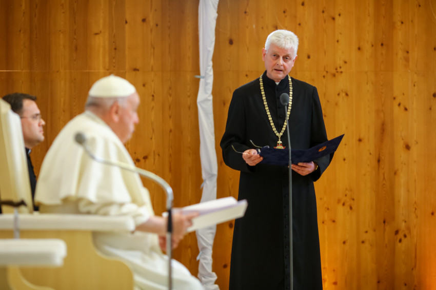 Délután Ferenc pápa a Pázmány Péter Katolikus Egyetem (PPKE) Információs Technológiai és Bionikai Karán az egyetemi és a kulturális élet képviselőivel találkozott. A Szentatyát az egyetem bejáratánál Kuminetz Géza, a PPKE rektora és Cserey György, a kar dékánja fogadta, majd Kuminetz Géza rektor mondott köszöntőt – a beszéd ITT olvasható.