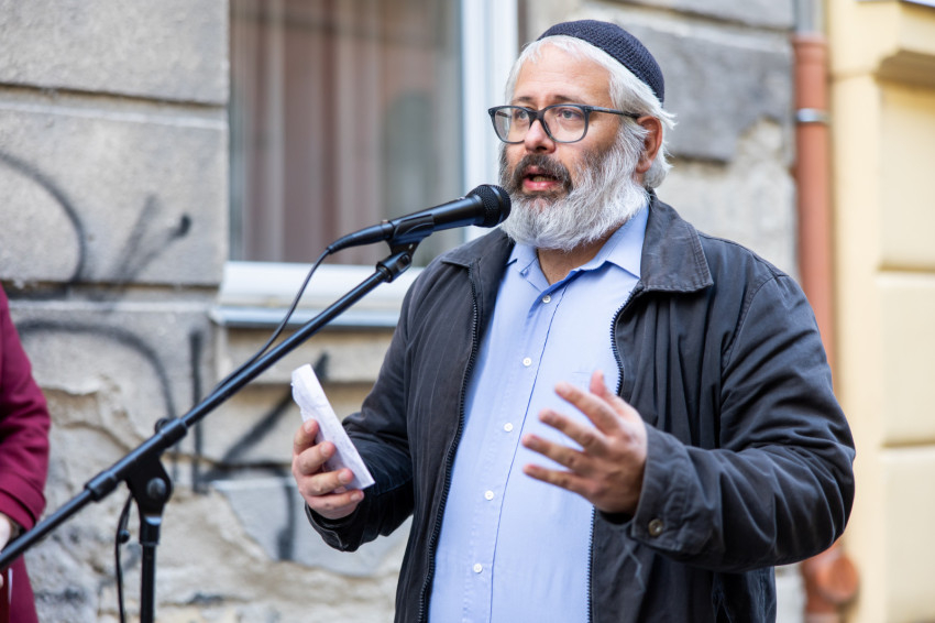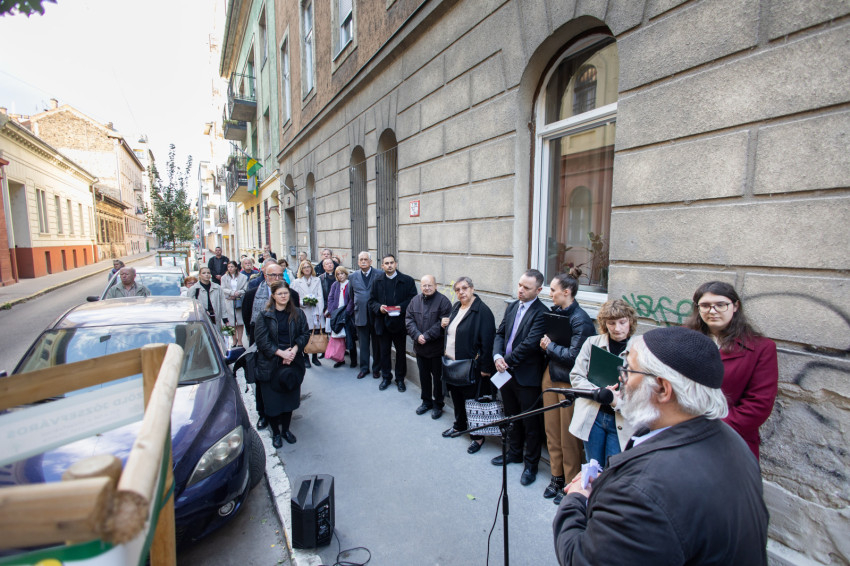 Végül felhívta a jelenlévők figyelmét egy hiányzó emléktábla nyomaira is: „Ezen a homlokzaton sokáig egy antifasiszta emléktábla állt. Nem találtunk még képet se róla, mert valamilyen aggályos szövegrész miatt a rendszerváltozás körül eltávolították. Nagyon örülök, hogy megfelelő szövegezéssel most ezt a hiányt is pótolhattuk.