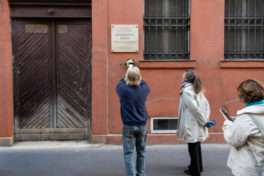 Mindszenty József új emléktáblája „a kommunizmus éveiben sok ártatlanul meghurcolt nemzeti hős” emléke előtt tiszteleg személyes kálváriájuk helyszínén;