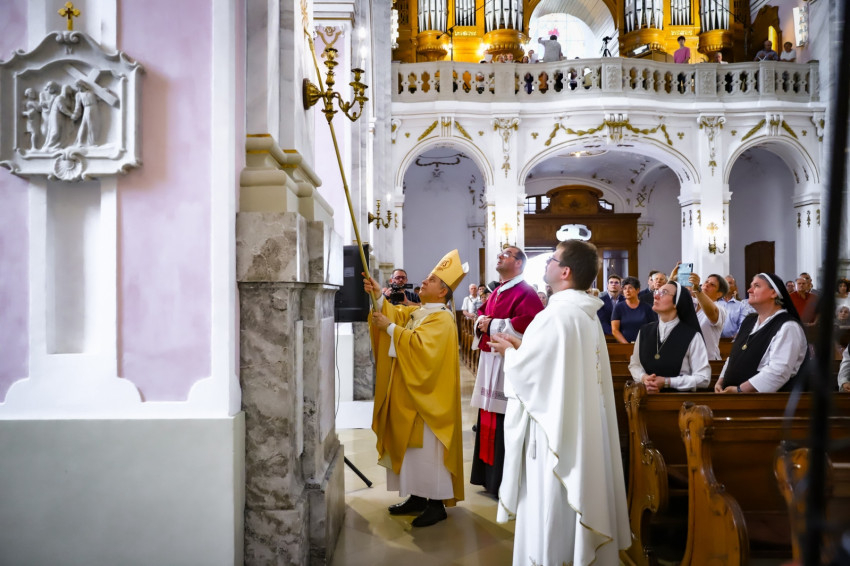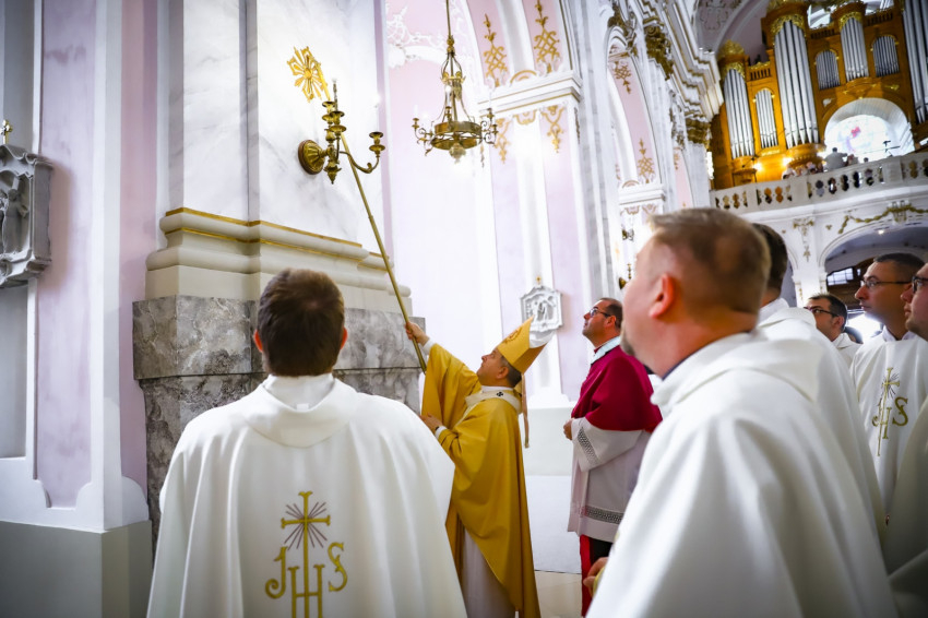 Az érseki jubileumot együtt ünnepelte a közösség a főszékesegyház konszekrálásával, vagyis teljes fölszentelésével. A főpásztor rámutatott, hogy a konszekrálásnak több jelentése is van a liturgiában: az ostyát, hogy Eucharisztia lehessen, konszekráljuk. De ugyanígy lehet épületeket, harangokat, kelyheket konszekrálni, vagyis krizmával megkenni, hogy jelezzük, többé már nem szolgálhat profán célokat, ez most már az Istené.
