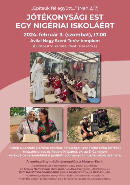 „És mivel Fodor Rékával hisszük, hogy nincs lehetetlen, ezért szeretnénk felépíteni Afrikában, Ogidiben egy iskolát, hogy értékes, reményteli jövője lehessen sok-sok kisgyereknek. Mert megérdemlik. Hálásan köszönjük az eddigi adományokat is, csak együtt sikerülhet!” – írta Regele Kriszti, akinek az együttese, a Cantate Domino zenekar lép fel a február 3-i jótékonysági esten.