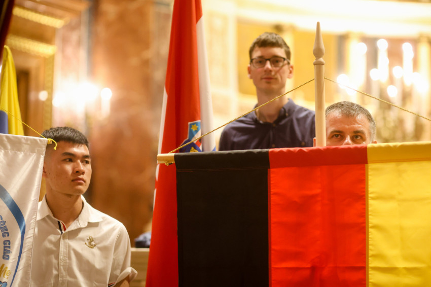 A Laudate Dominum kezdetű taizéi ének ünnepélyes orgonakíséretére bevonultak a különböző idegen nyelvű közösségek képviselői zászlóikkal, változatos öltözékekben, népviseleteikben, valamint a püspökök és számos pap, az idegen ajkú Magyarországon élő és a külföldi magyar közösségek lelkipásztorai.
