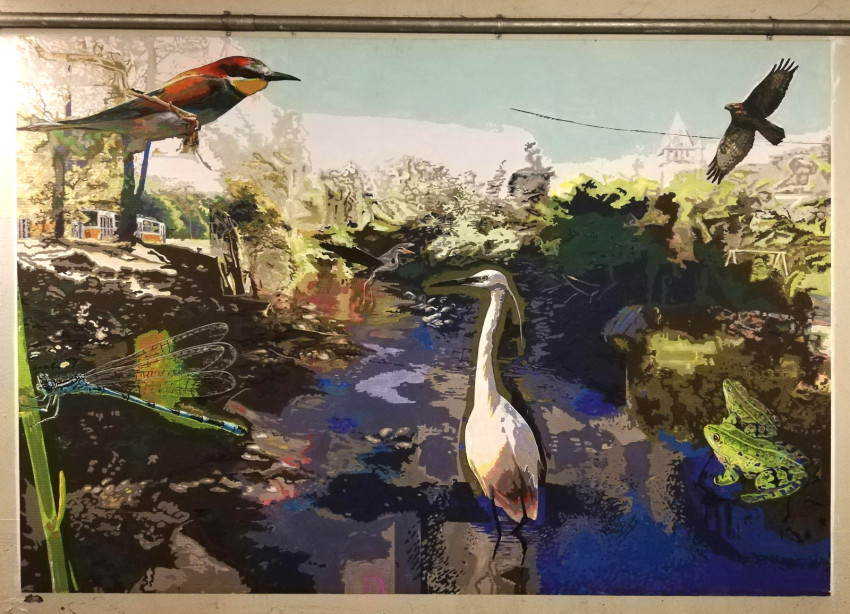 Egy másik festményen vízimadarak, békák, szitakötők népesítik be a patak medrét, s a háttérben halványan feltűnik a Törley-kastély négyszögletes tornya, balról pedig a 41-es villamos sárga sziluettje. A falképeken mindenfelé a környék jellegzetes épületei és növényei láthatók, mindez igényesen, megfelelő szakmai tudással megjelenítve. Tudom, ezek a falképek nem az úgynevezett magas művészet kategóriájába tartoznak. (Olvasóink megszokhatták, hogy általában ilyen alkotásokról írunk.) De vannak a városnak olyan, nemritkán eldugott közterei, ahol sokan megfordulnak, vagy ahol egyszerűen csak nagy az átmenő forgalom, s éppen ezért érdemes mintegy felemelni, kulturálttá, barátságossá tenni őket.
