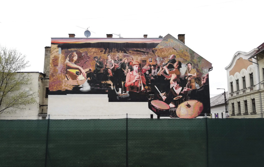 A másik falfestmény a Mihalik Sándor utca sarkánál látható, ezen egy vidám társaság gitáron, dobon, szaxofonon játszik. Emlékszem, amikor kép készült, Majoros István képzőművész és társa ott álltak az állványokon a forró nyári napsütésben, nyakig festékesen, és megállás nélkül dolgoztak. Annyi idejük sem volt, hogy kicsit lejöjjenek hozzám beszélgetni a készülő műről.