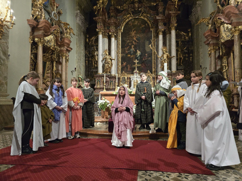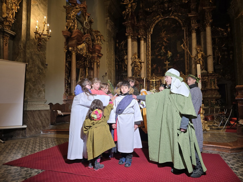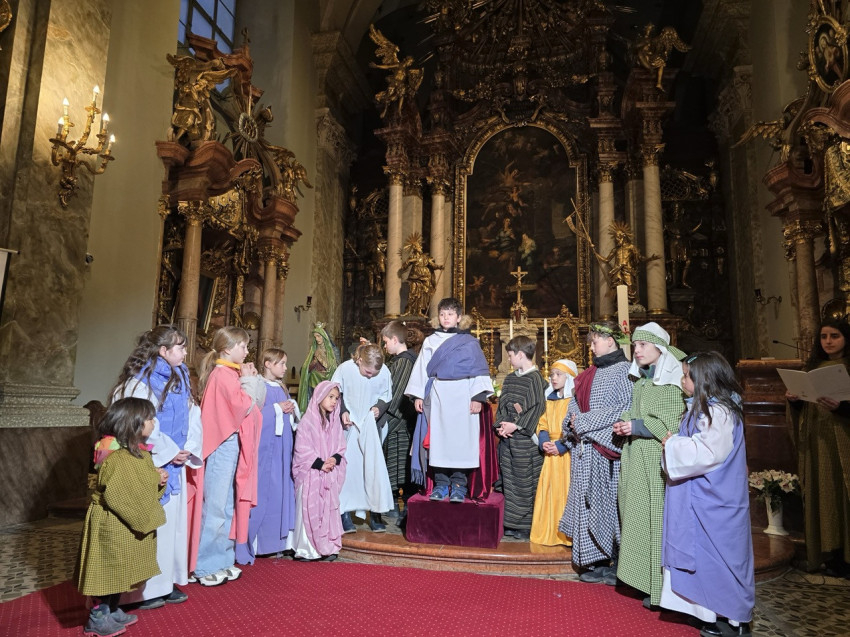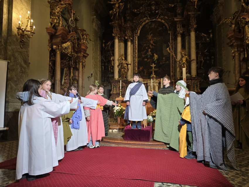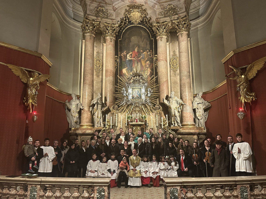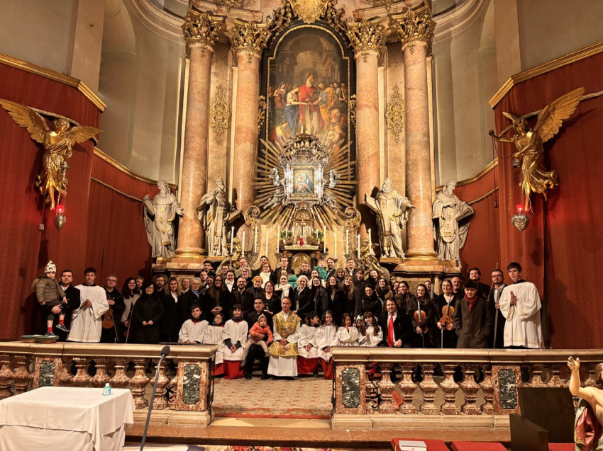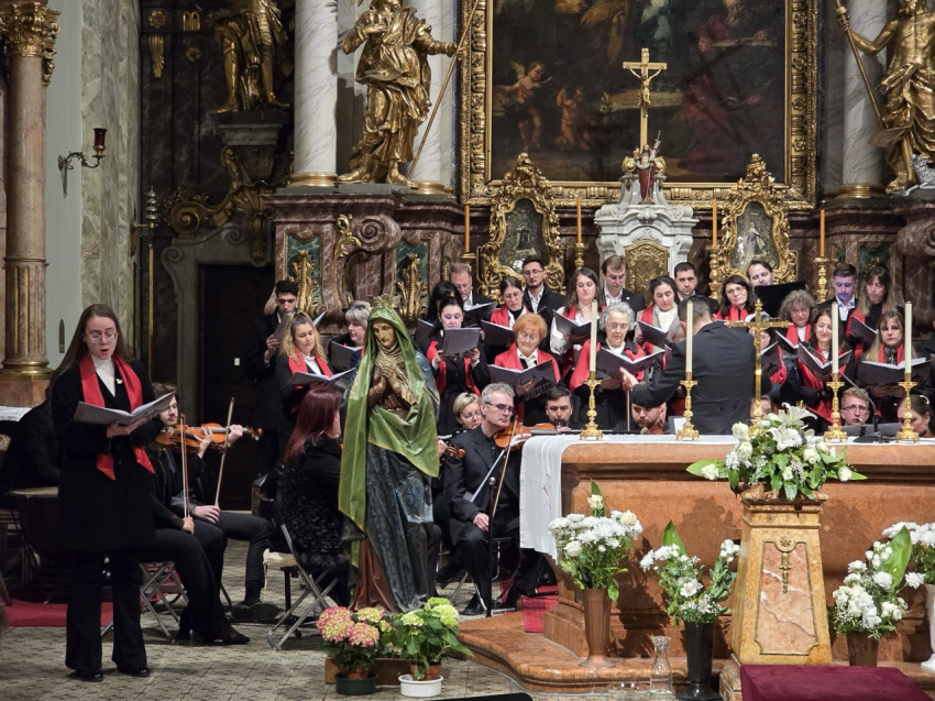 A nap második felében a bécsi piarista templomban került sor szentmisére, ami különös jelentőséggel bírt, hiszen ebben a templomban tanult és szolgált egykor Ruzitska György orgonistasegédként, és Joseph Haydn vezénylete alatt számozott basszust játszott. Húsvét nyolcadát ünnepelve Max Filke Terra tremuit című műve is elhangzott. A szentmise végén pedig a kórus a már védjegyévé vált Horváth Márton Levente Szent Mihály-himnuszát adta elő. A szentmise főcelebránsa a piarista rend osztrák tartományának elöljárója, Labancz Zsolt SchP volt, aki köszöntötte a kolozsvári közösséget és magyar nyelven is prédikált. A zenei szolgálat Ruzitska György kötődése mellett azáltal vált különösen széppé, hogy a Szent Cecília közösség gyermekei ministráltak, az éppen azon a napon ezüstmiséjét ünneplő Labancz Zsolt mellett.
